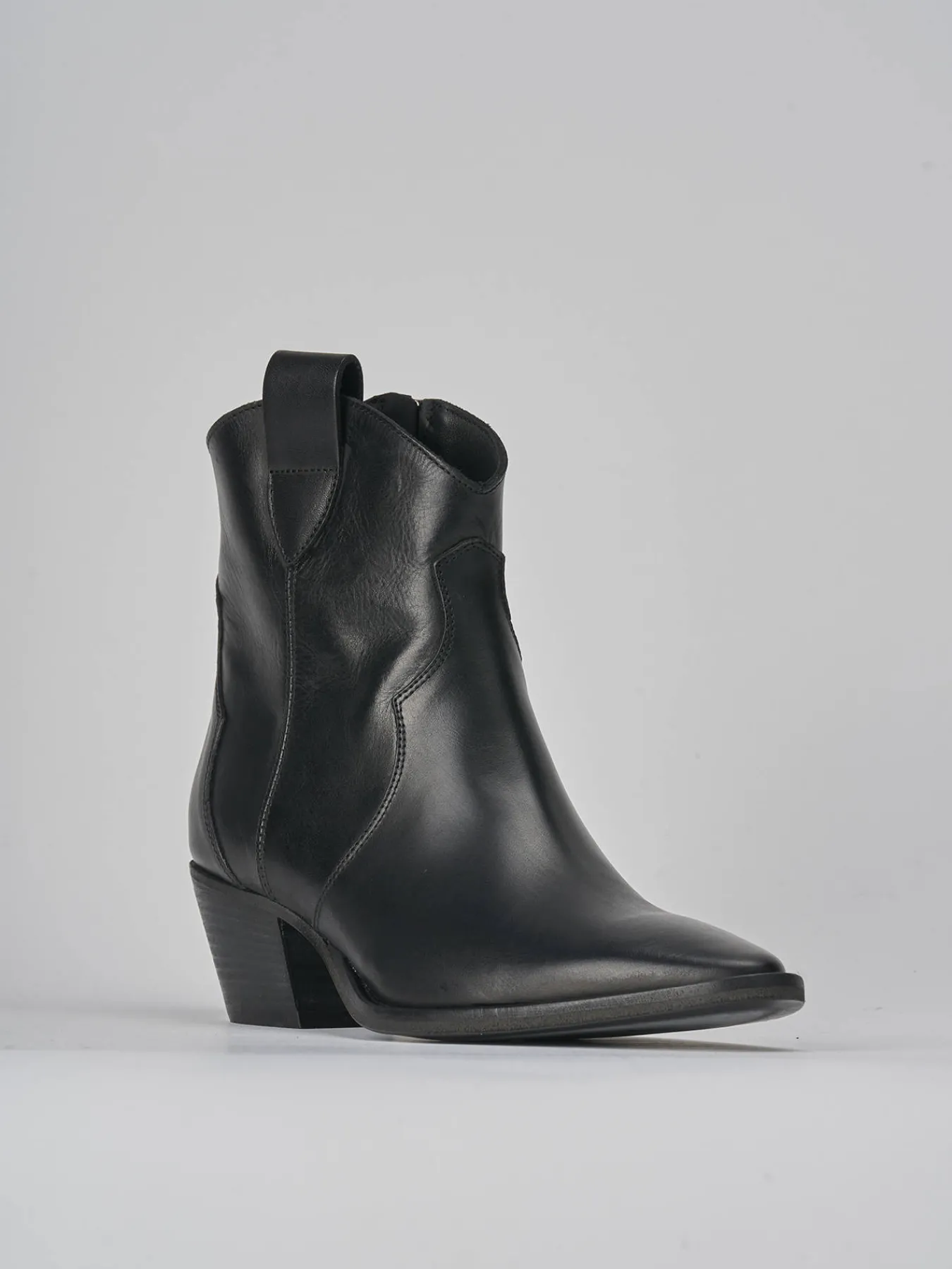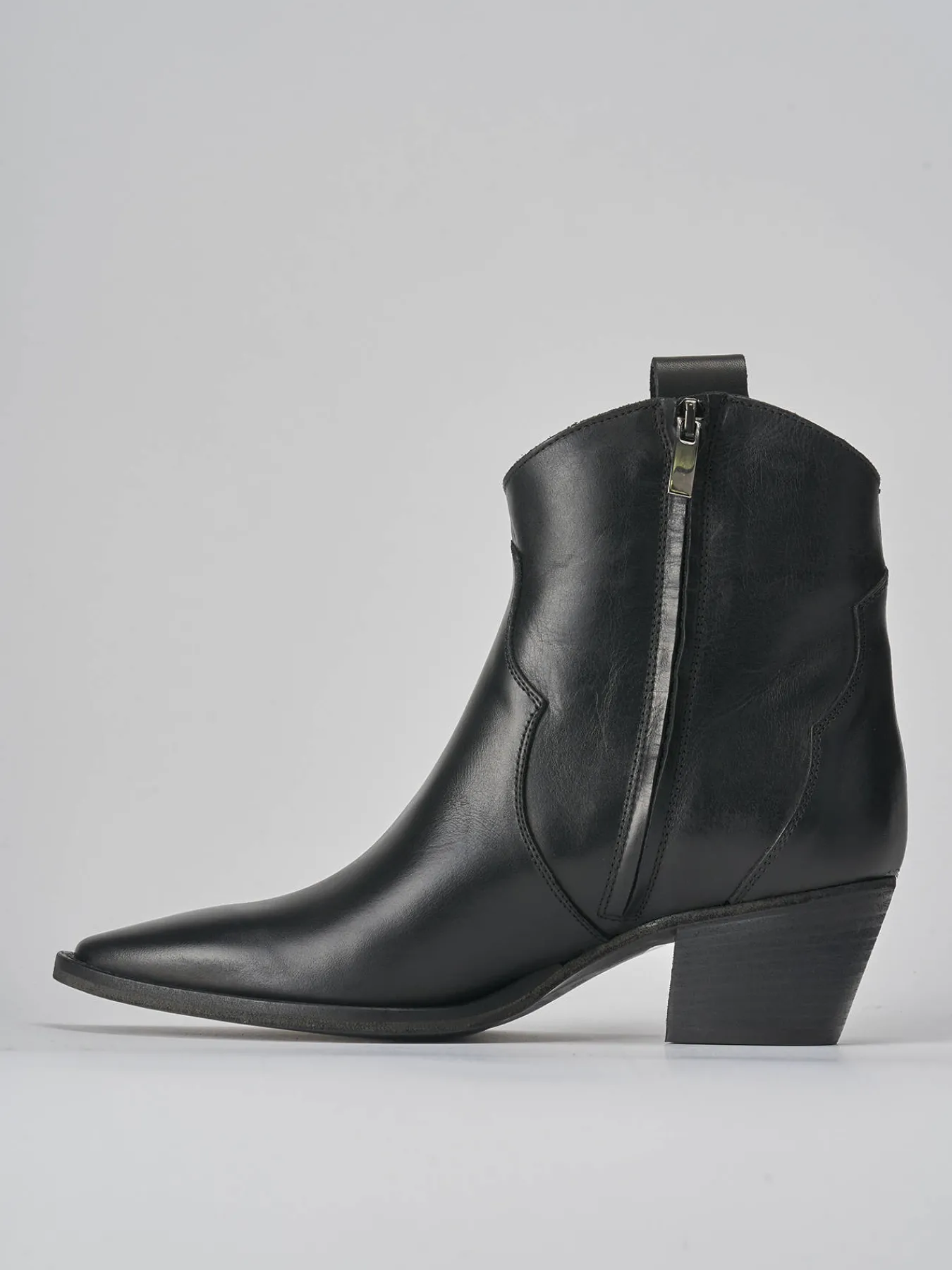 Stivaletto texano tacco 5 cm fondo in cuoio e soletto interno in vera pelle. tomaia in morbida pelle, punta sfilata, cuciture a mano, ghetta, comoda cerniera laterale e comodo tacco cubano per un look tex cool.