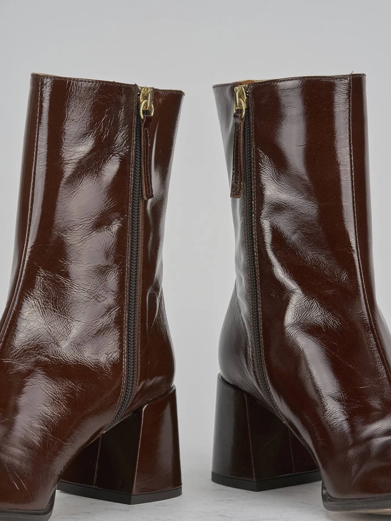 La tomaia in morbida pelle effetto verniciato conferisce una lucentezza brillante, mentre la punta squadrata e le cuciture visibili aggiungono dettagli di stile unici.
