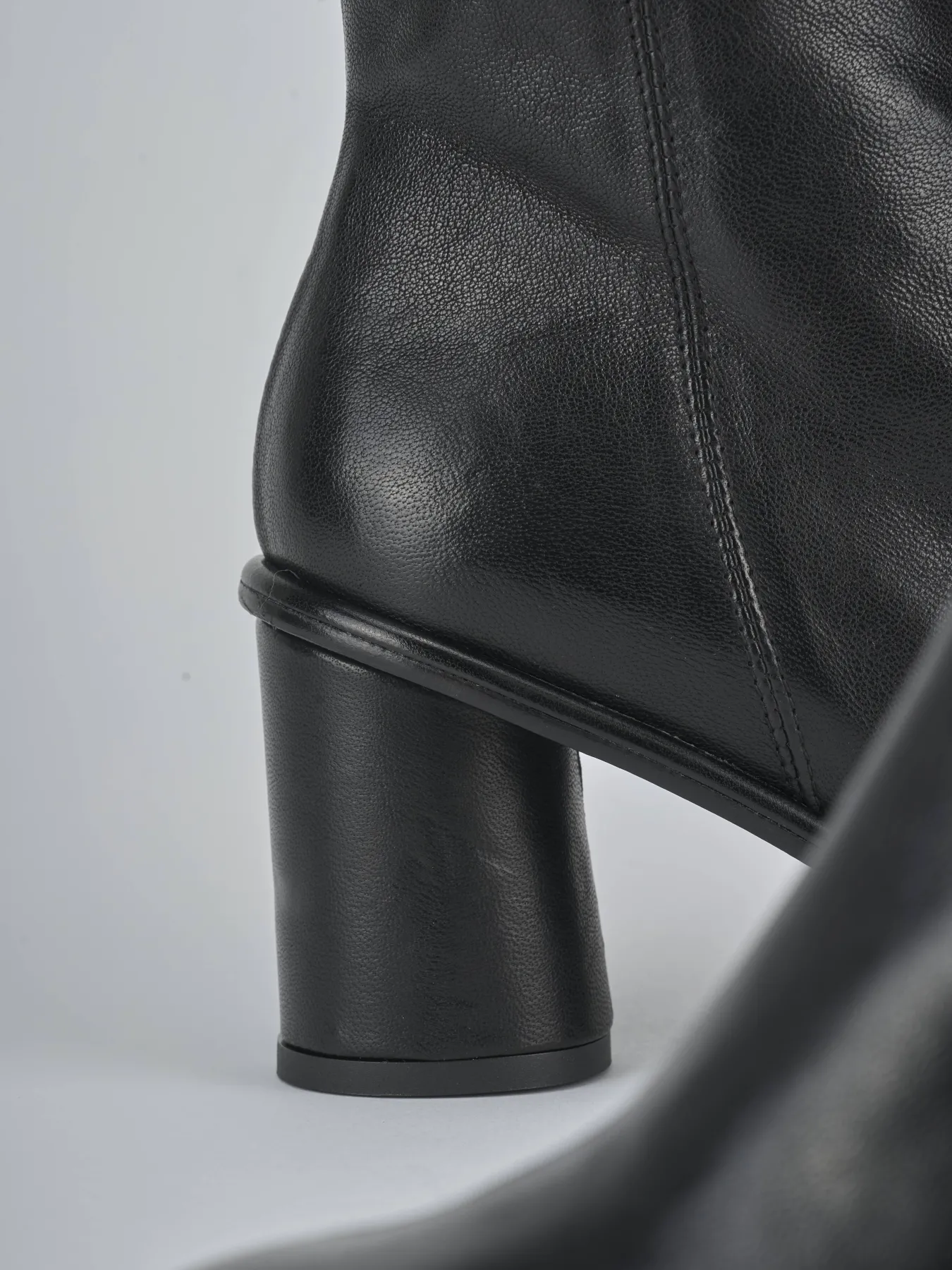 Stivaletto tacco 6 cm fondo in cuoio e soletto interno in vera pelle. Tomaia in morbida pelle, punta affusolata, cuciture a mano, rapida chiusura con cerniera laterale e tacco cilindrico per un look cool. Perfetto per ogni stagione.