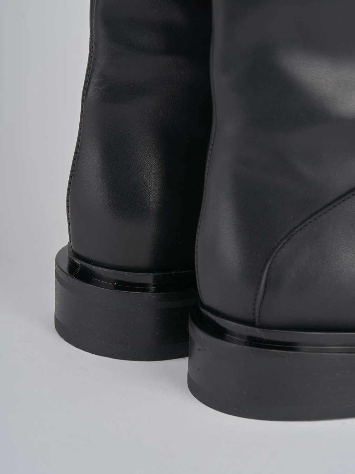 Stivale tacco 2 cm fondo in gomma e soletto interno in vera pelle. Tomaia in morbida pelle, punta tonda, cuciture visibili, dettaglio cucitura obliqua sul gambale che misura appena sotto il ginocchio e tacco solido per uno stivale che non passa mai di moda.
