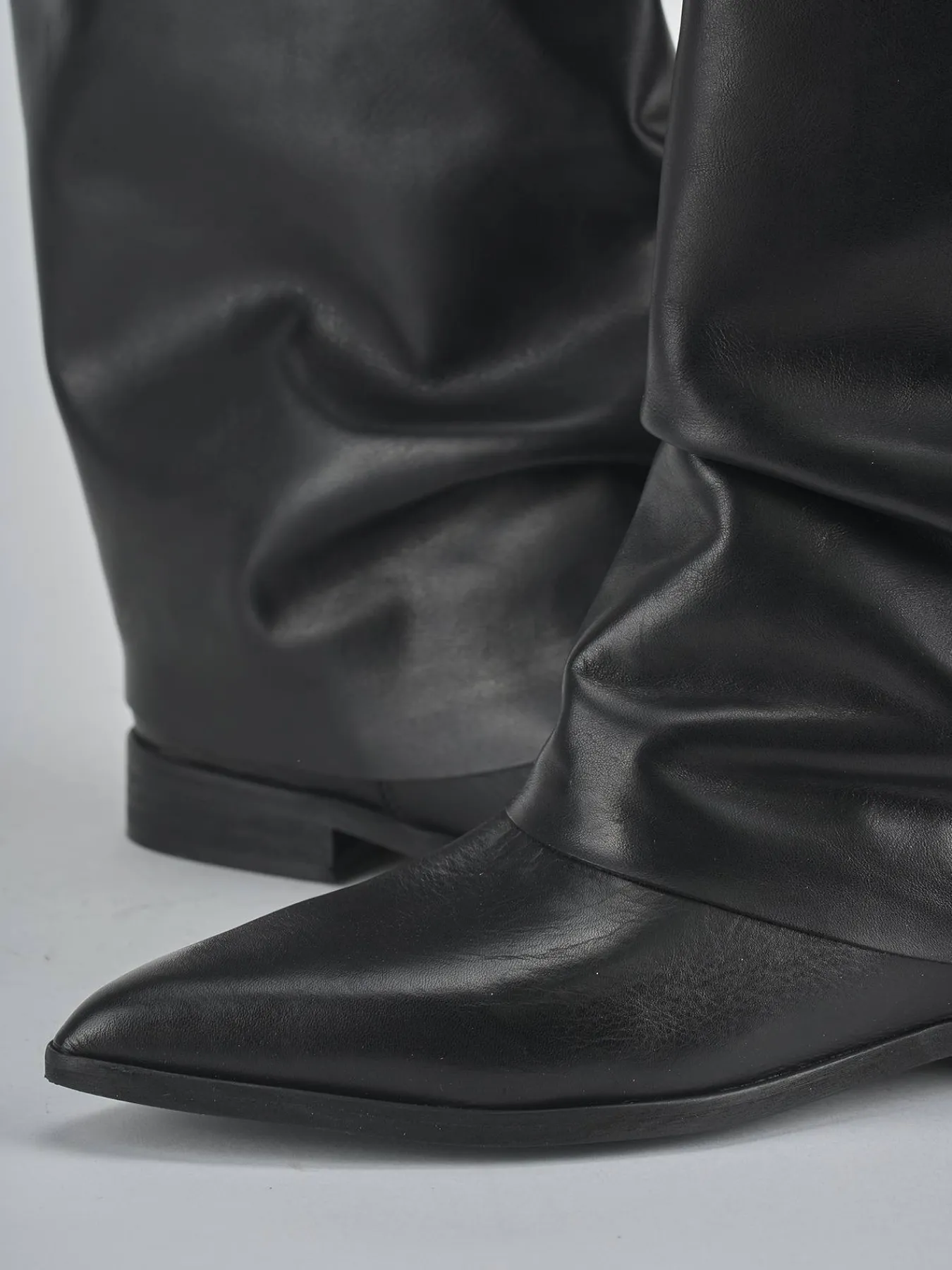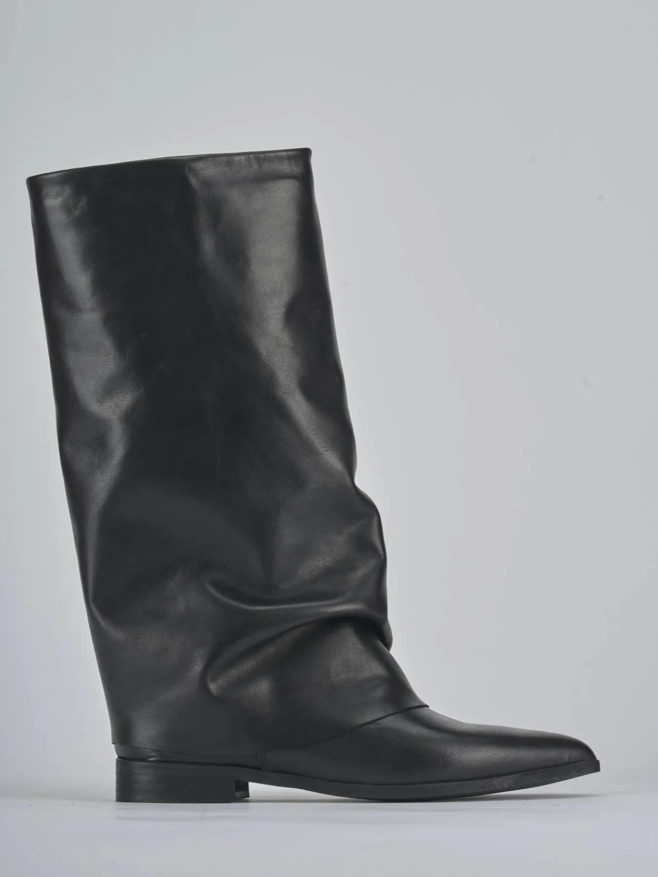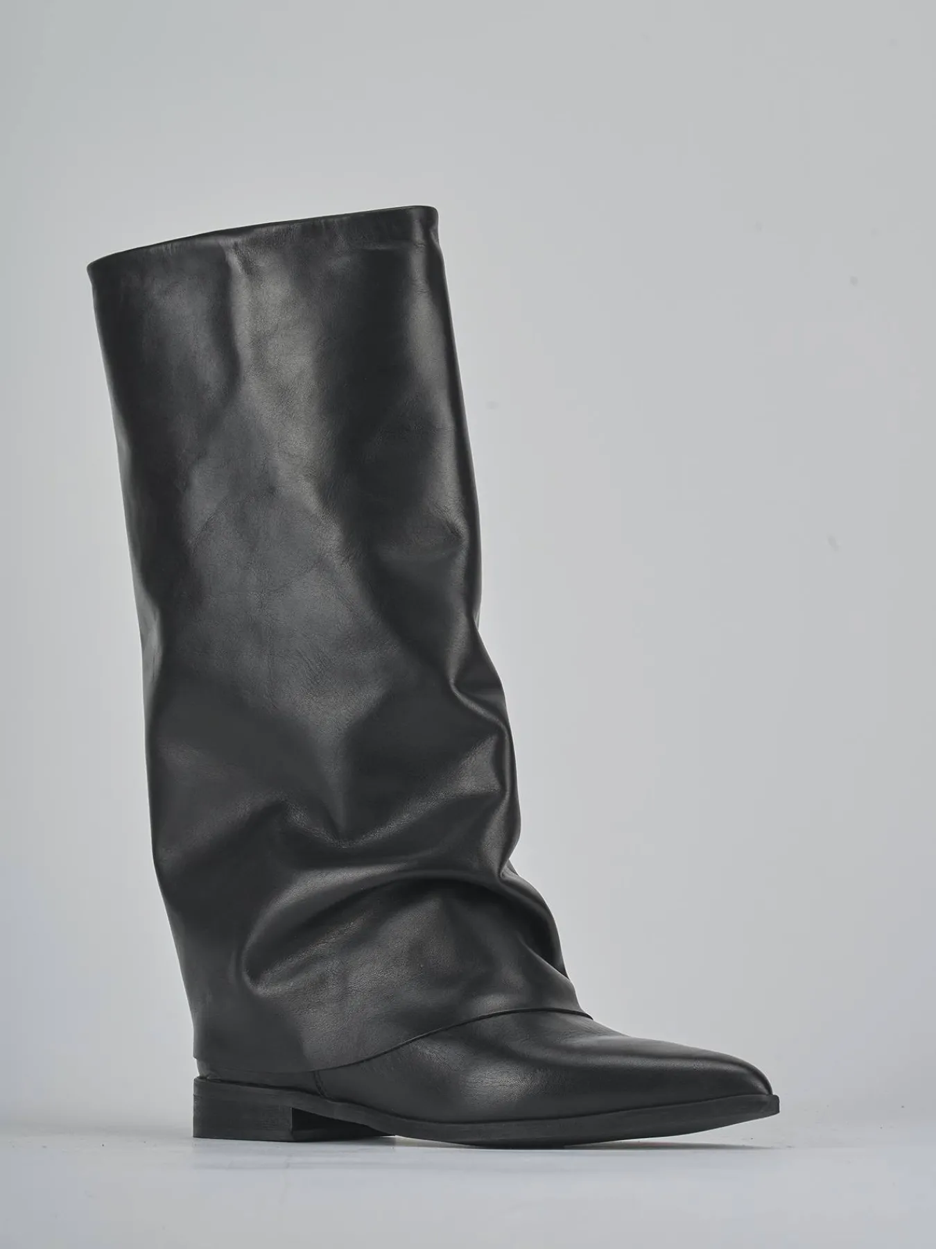 Stivale tacco 2 cm fondo in gomma e soletto interno in vera pelle. Tomaia in morbida pelle, punta sfilata, risvolto aderente sul gambale che si arriccia e che misura a 3cm dal ginocchio. Dalle linee versatili per ogni tuo look.