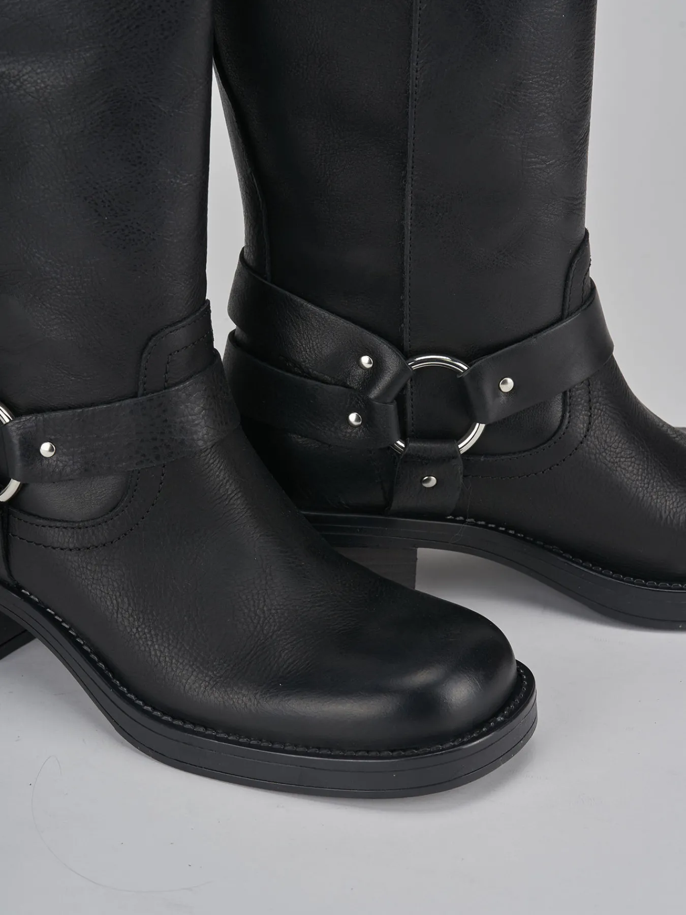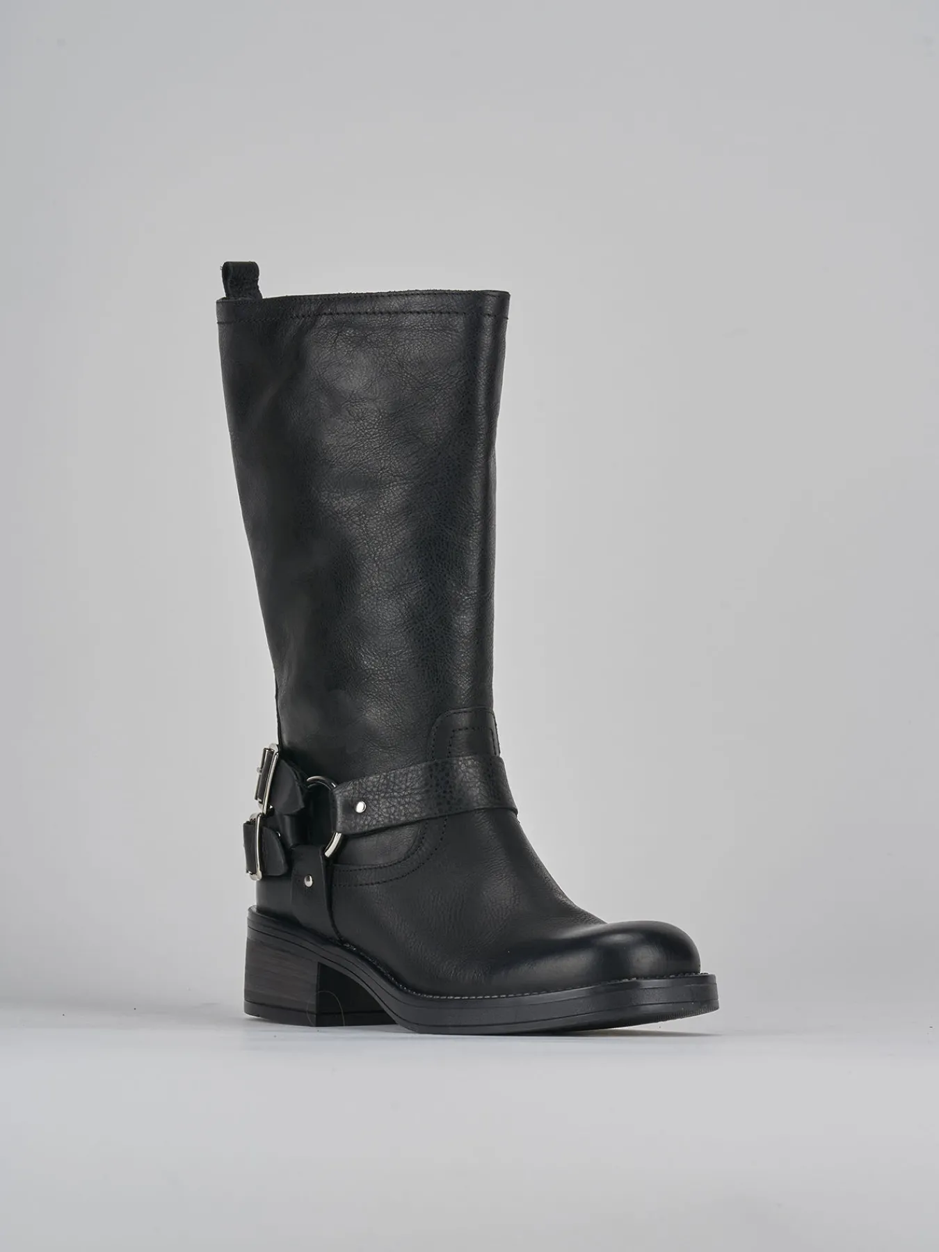 stivale biker tacco 5 cm fondo in gomma e soletto interno in vera pelle. tomaia in morbida pelle, punta squadrata, cuciture sulla tomaia, gambale tubolare a 3/4 con fibbia in caviglia. versatile sia con una gonna che dei jeans per un look biker perfetto.