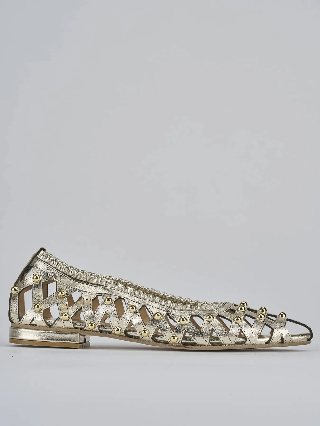 Ballerina tacco 2 cm, fondo in cuoio e soletto interno in vera pelle. Tomaia in morbida pelle, punta sfilata, traforata con borchie ed elastico per una comoda calzata.