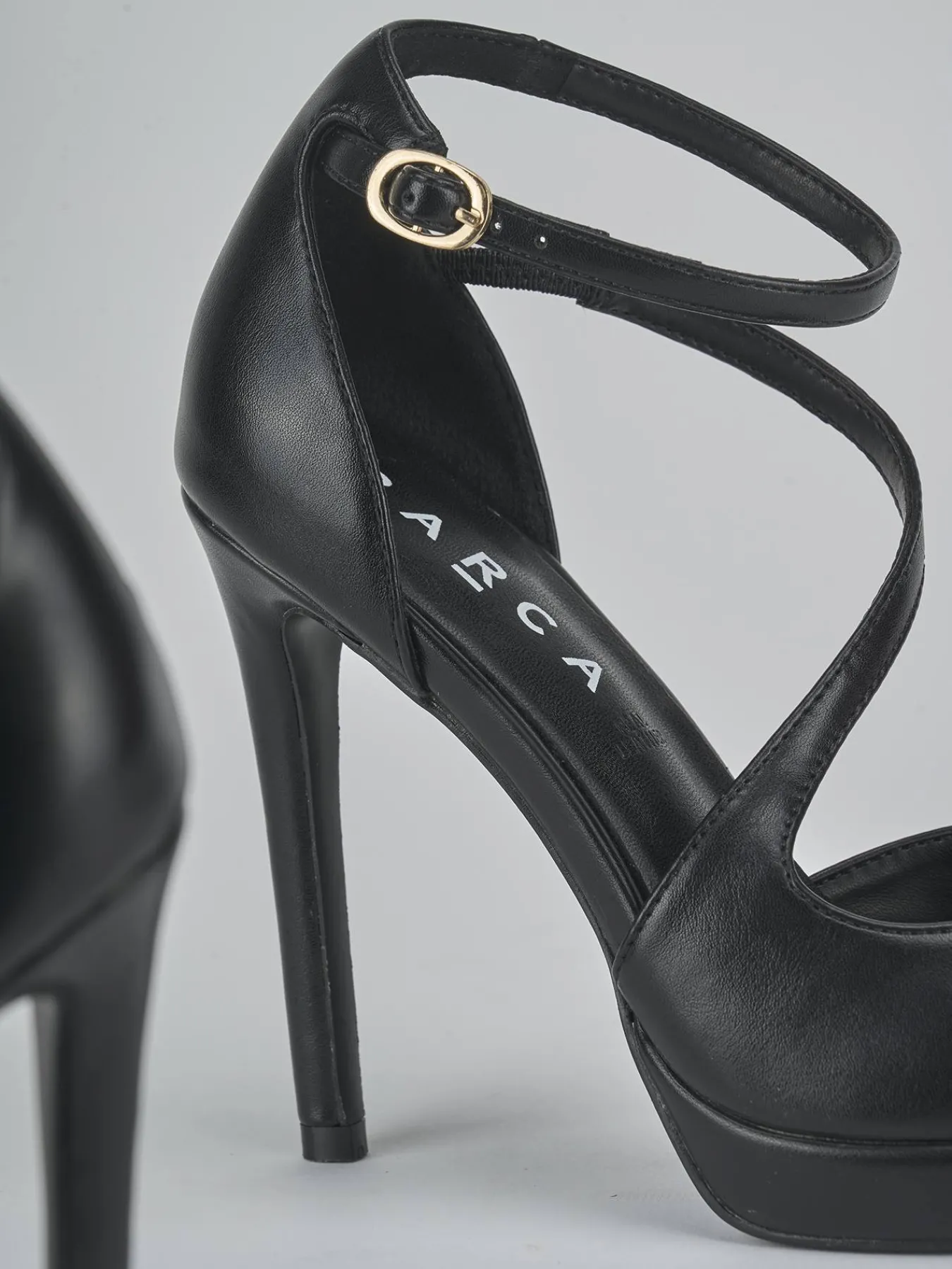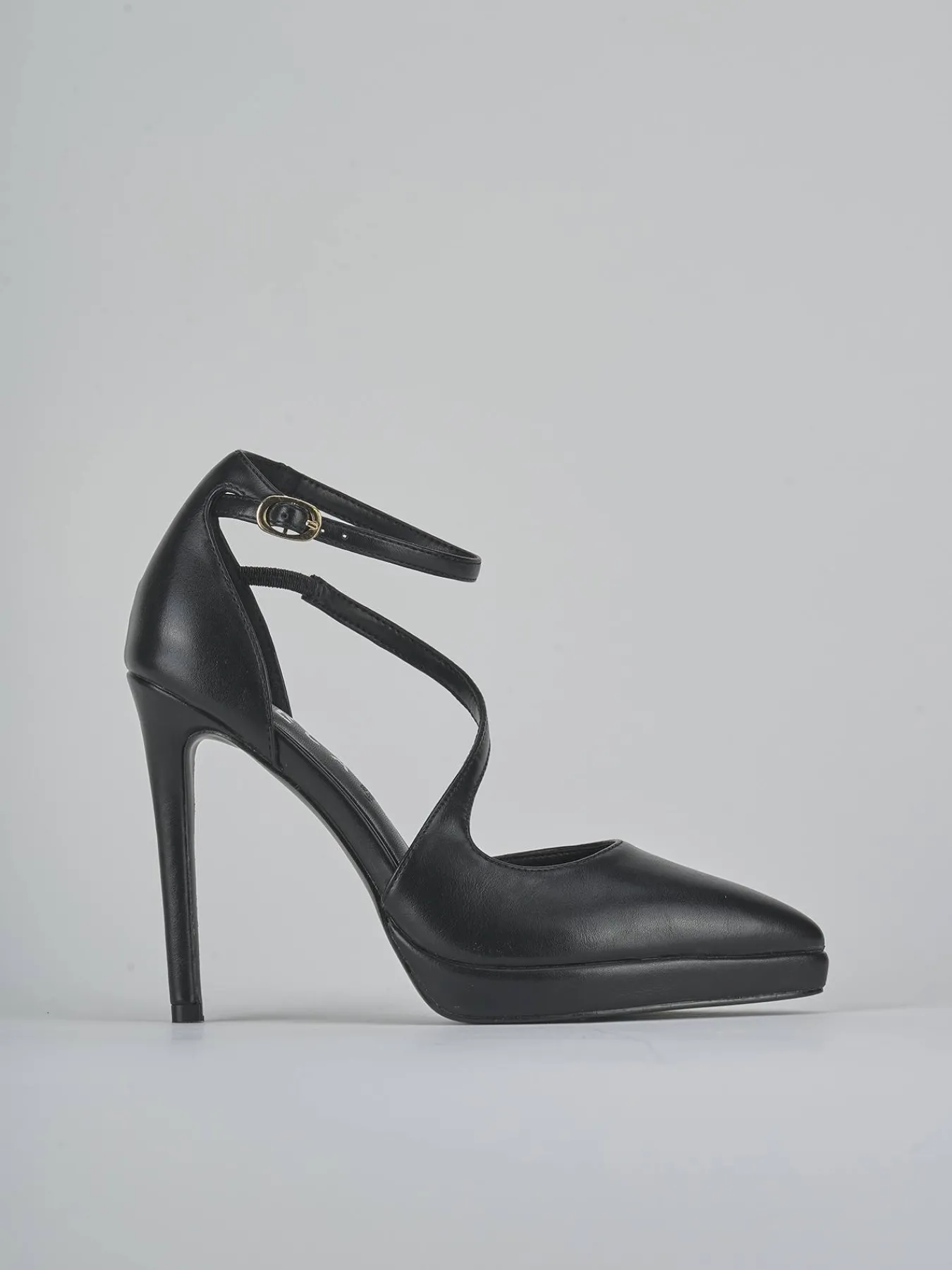 Realizzato in pelle sostenibile di colore nero, questo modello vanta un tacco di 10 cm che slancia la figura, mentre il piccolo plateau anteriore di 1 cm garantisce un comfort sorprendente.