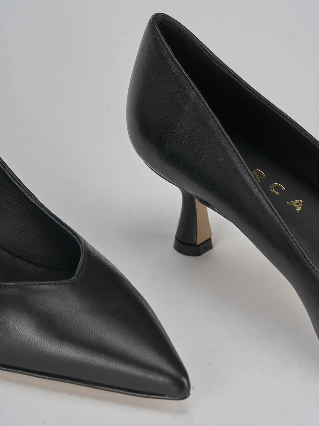 La tomaia è realizzata in morbida pelle, garantendo comfort e qualità, mentre la punta sfilata e lo scollo a “V” sul collo del piede conferiscono un aspetto slanciato e chic.