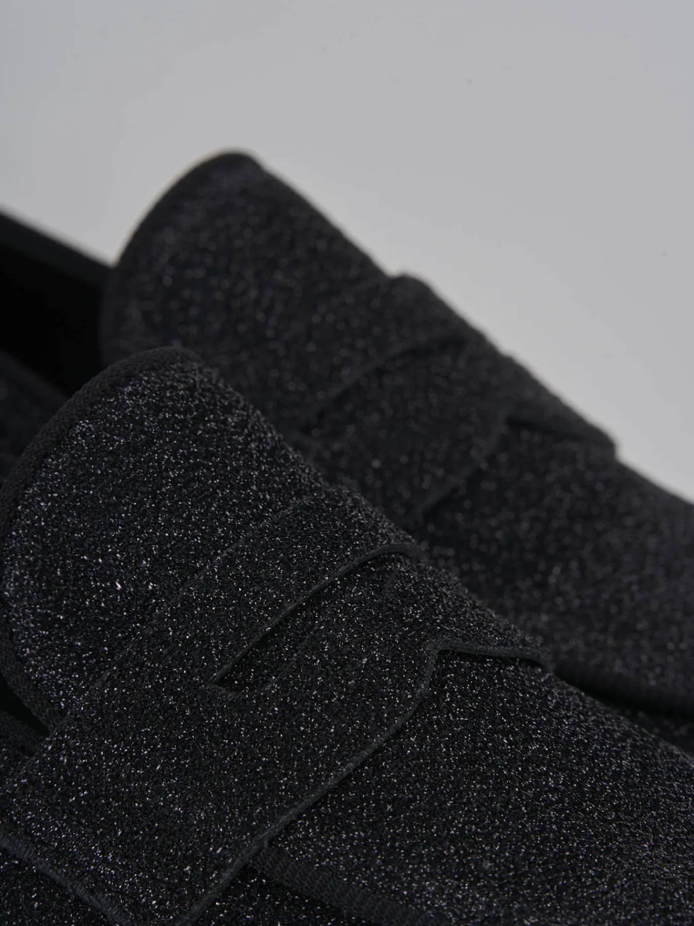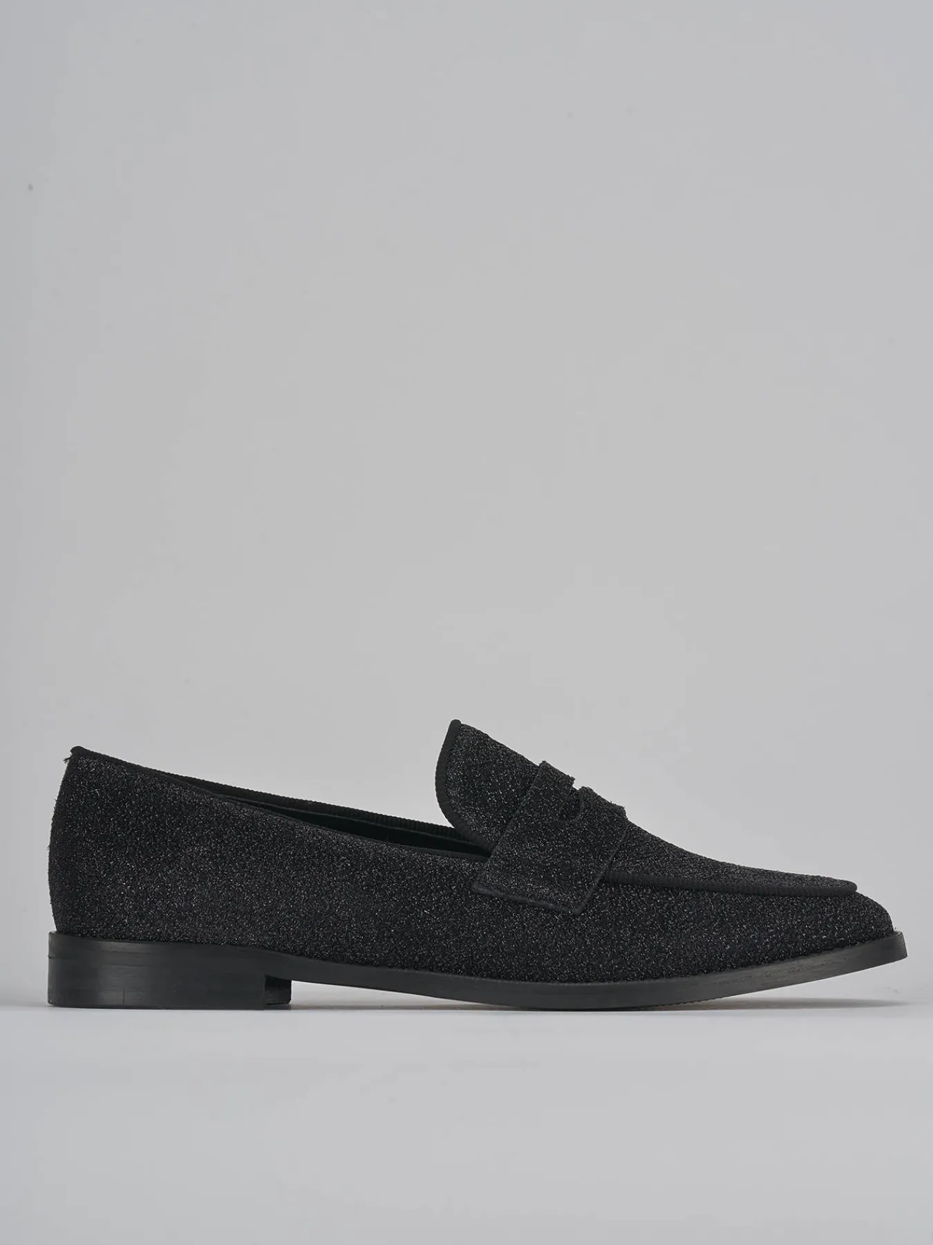 mocassino tacco 2 cm fondo in gomma e soletto interno in vera pelle. tomaia in morbida pelle foderata in tessuto glitterato, punta affusolata, cuciture a vista, mascherina a bocca di leone per un tocco fun ai tuoi look.