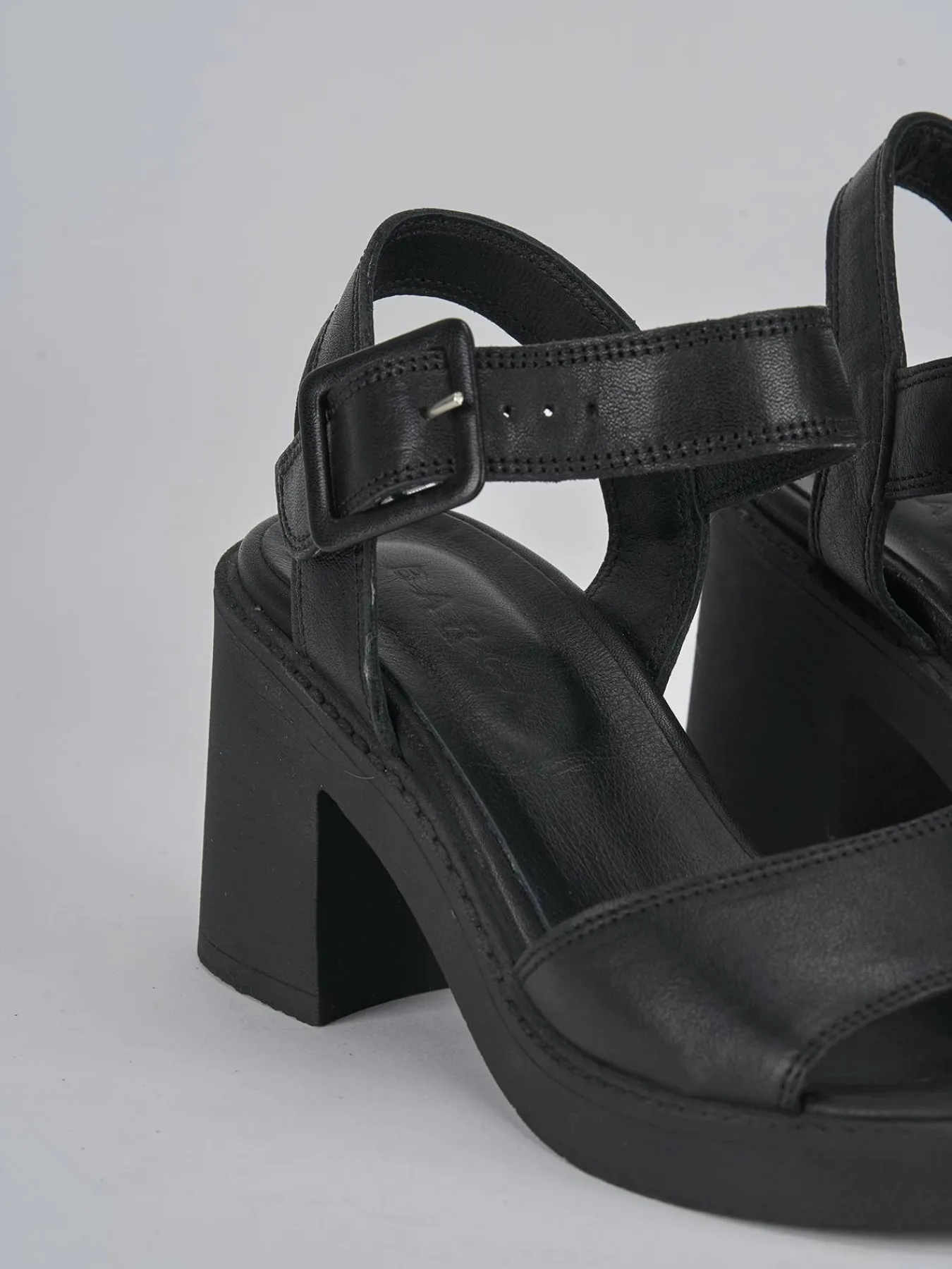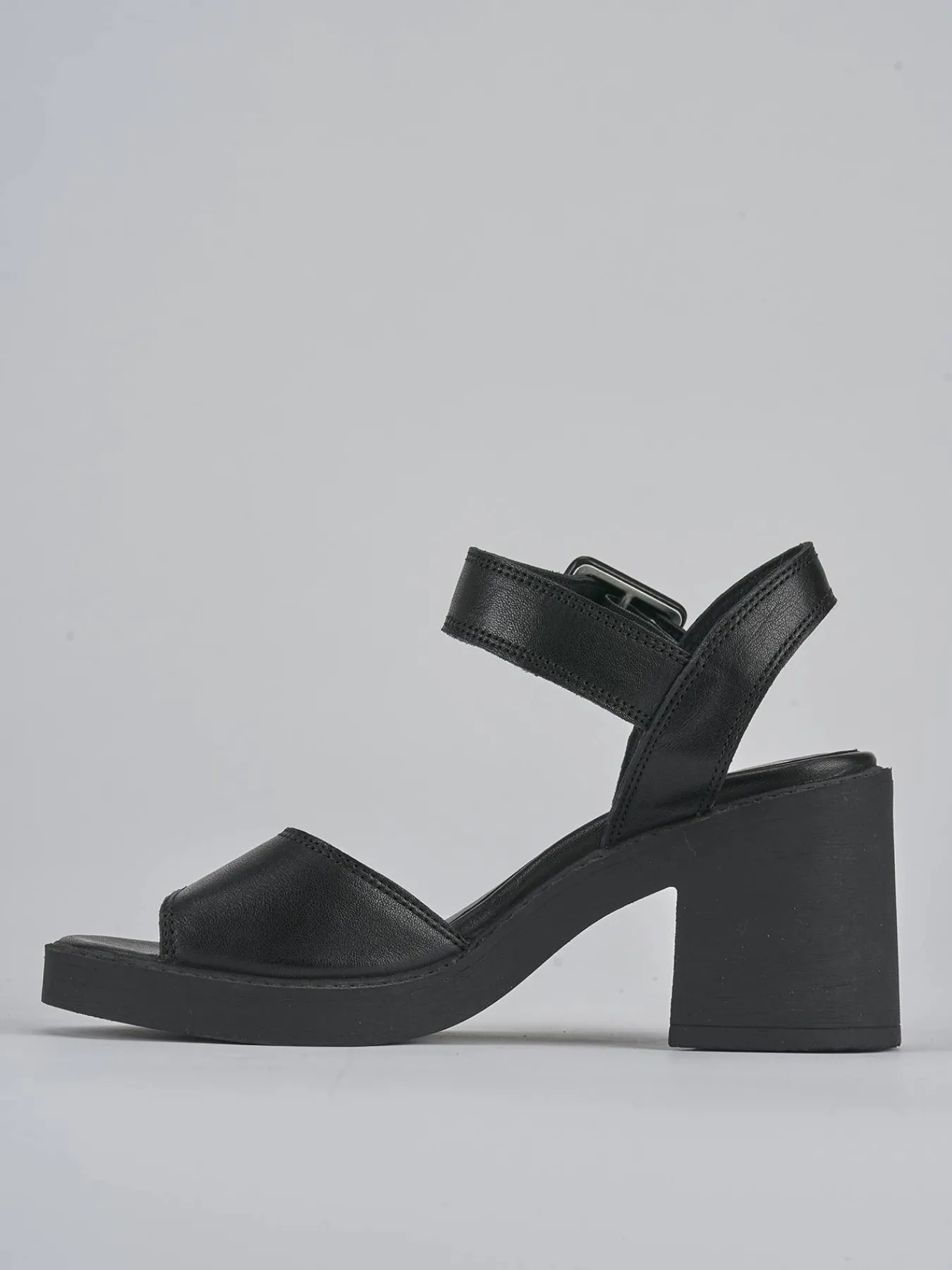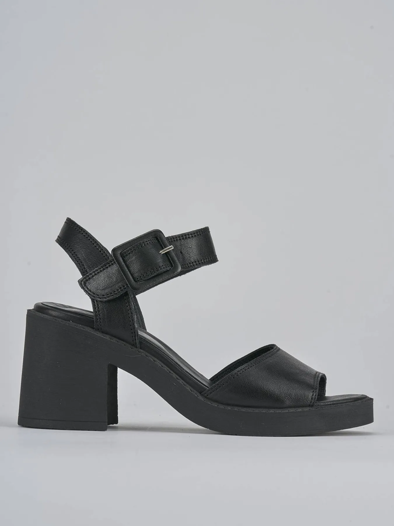 Sandalo tacco 7 cm fondo in leggerissima gomma e soletto interno in vera pelle. Tomaia in morbida pelle, punta tonda, fascia unica in punta, cinturino con fibbia regolabile e piccolo plateau di 1 cm sulla parte anteriore. Per un look cool. Tacco grosso per il massimo del comfort.