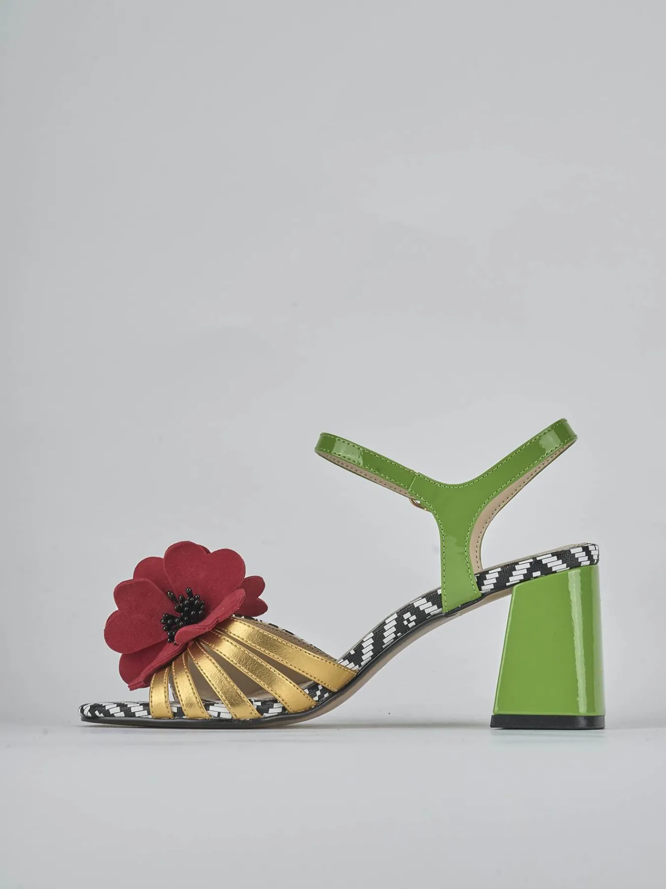 Sandalo tacco 7 cm fondo in gomma e soletto interno in vera pelle. Tomaia in morbida pelle, punta leggermente squadrata, fascia, accessorio floreale, cinturino in caviglia con fibbia regolabile e tacco grosso stabile. Perfetto con una gonna e t-shirt.