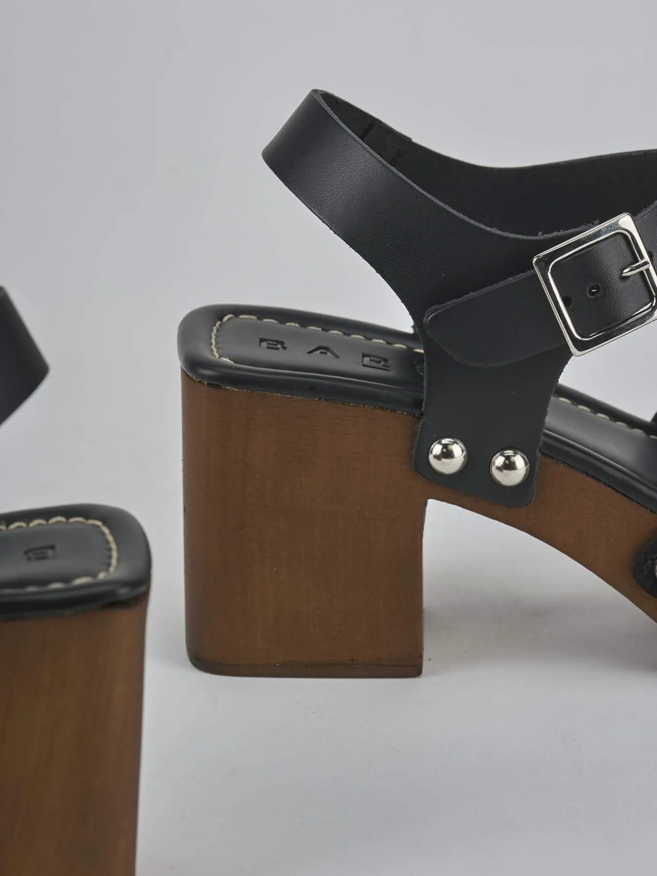 Sandalo tacco 8 cm fondo in gomma e soletto interno in vera pelle. Tomaia in morbido camoscio, punta leggermente squadrata, fascia unica in punta, cuciture visibili, borchie laterali e cinturino con fibbia regolabile in caviglia . Plateau anteriore di 1.5 cm e tacco stabile per un look cool.