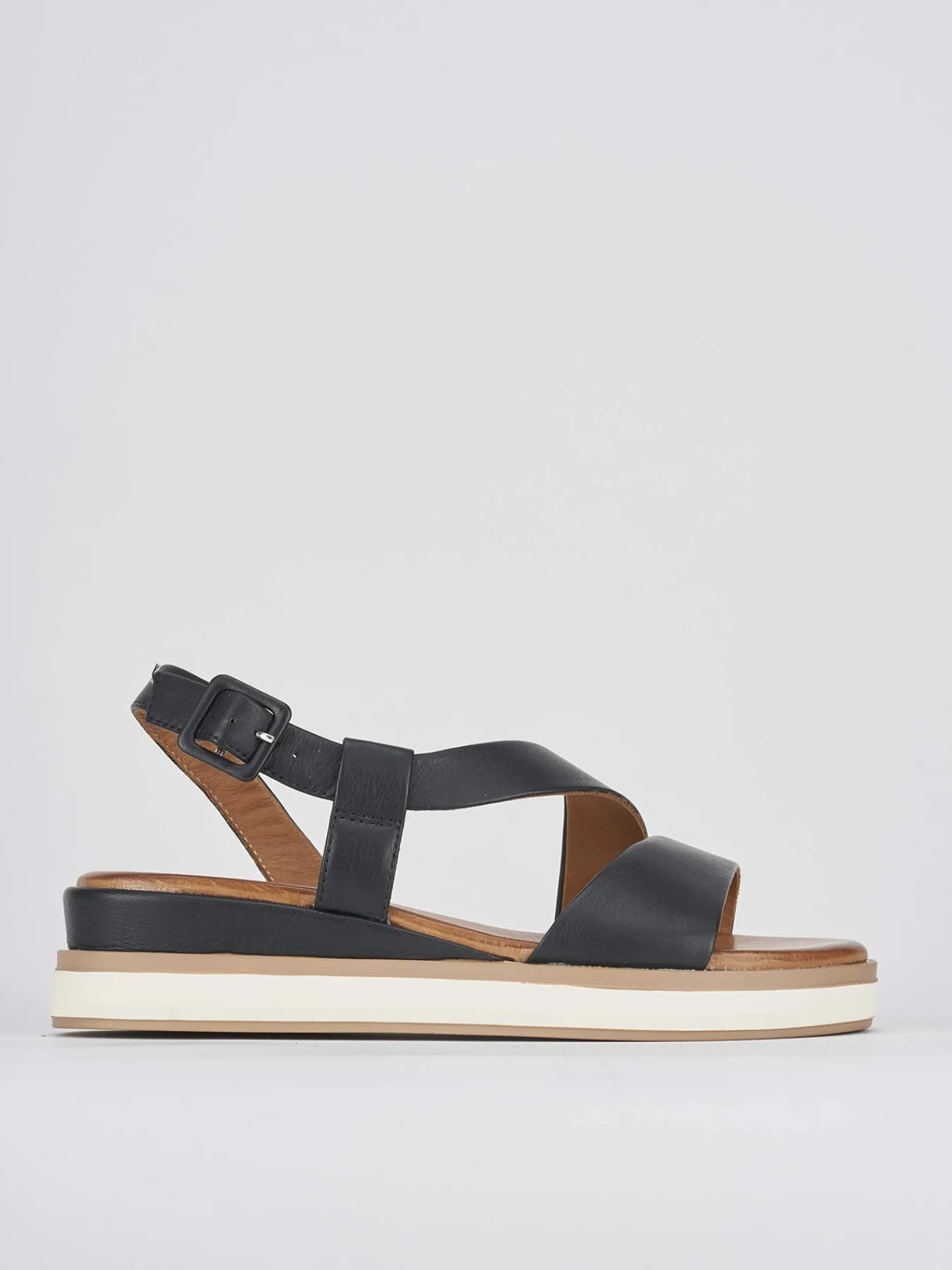 sandalo zeppa 4 cm fondo in leggera gomma e soletto interno in vera pelle. tomaia in morbida pelle, fascia unica in punta, fascia unica obliqua sul collo del piede e cinturino con fibbia regolabile per un look cool.