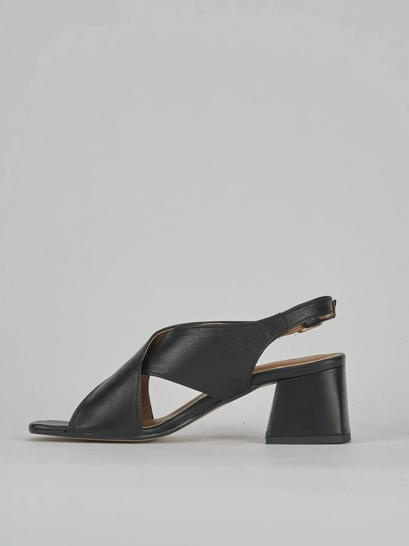Sandalo tacco 5 cm, fondo in cuoio e soletto interno in vera pelle. Tomaia in morbida pelle, punta leggermente squadrata, fasce ampie incrociate che avvolgono il piede, cinturino con fibbia regolabile in caviglia. Tacco grosso per il massimo del comfort.
