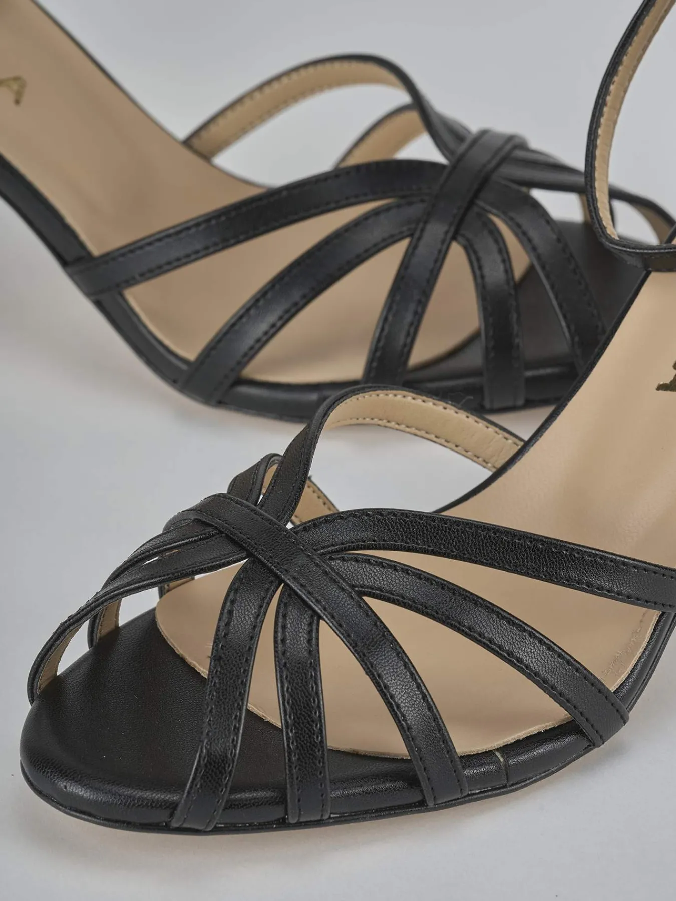 Sandalo tacco 7 cm, fondo in leggerissima gomma e soletto interno in vera pelle. Tomaia in morbida nappa, punta affusolata con fascia a cestina aperta in punta, cinturino in caviglia con fibbia regolabile e tallone chiuso. per un look so-cool!