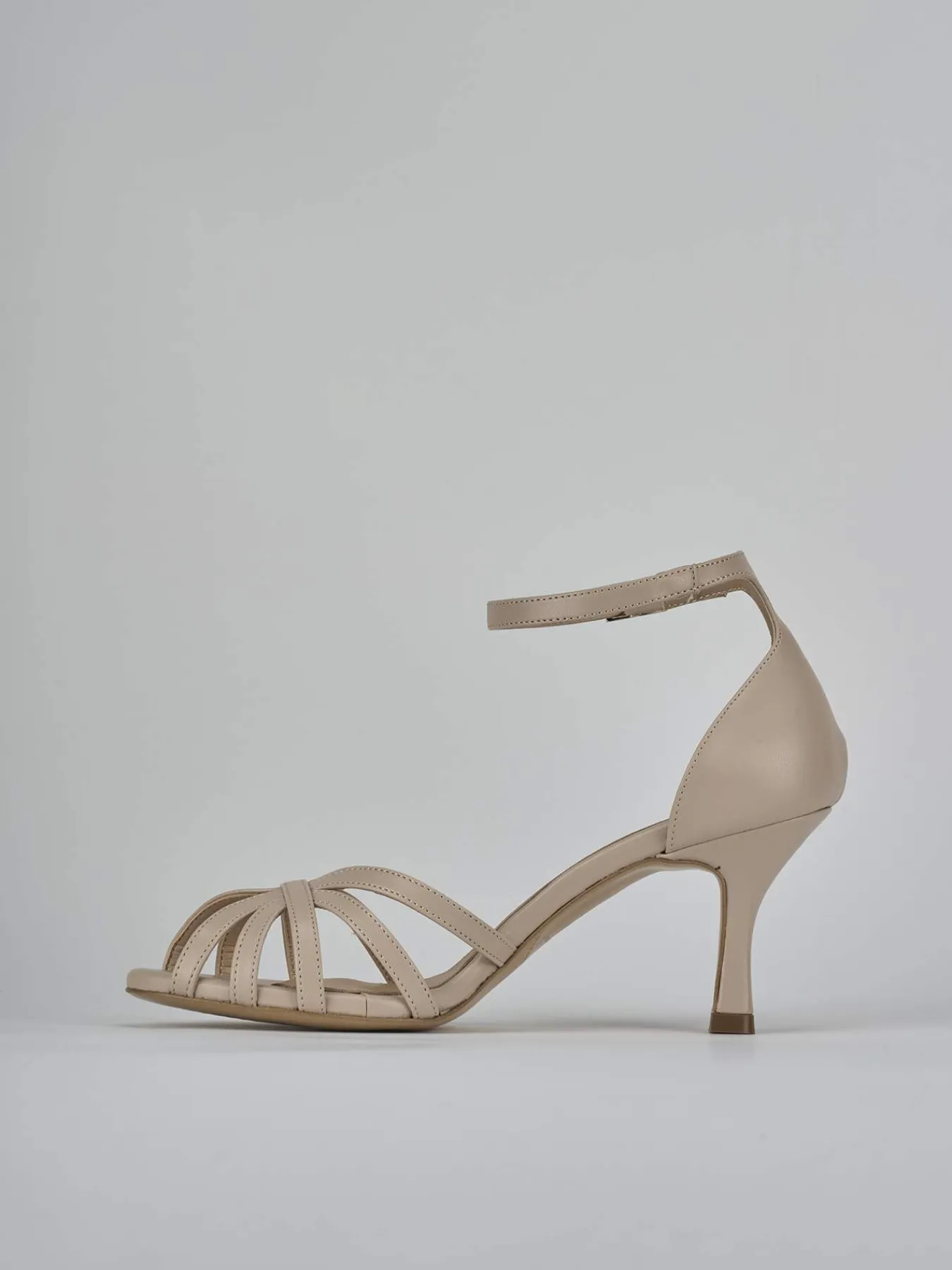 Sandalo tacco 7 cm, fondo in leggerissima gomma e soletto interno in vera pelle. Tomaia in morbida nappa, punta affusolata con fascia a cestina aperta in punta, cinturino in caviglia con fibbia regolabile e tallone chiuso. per un look so-cool!