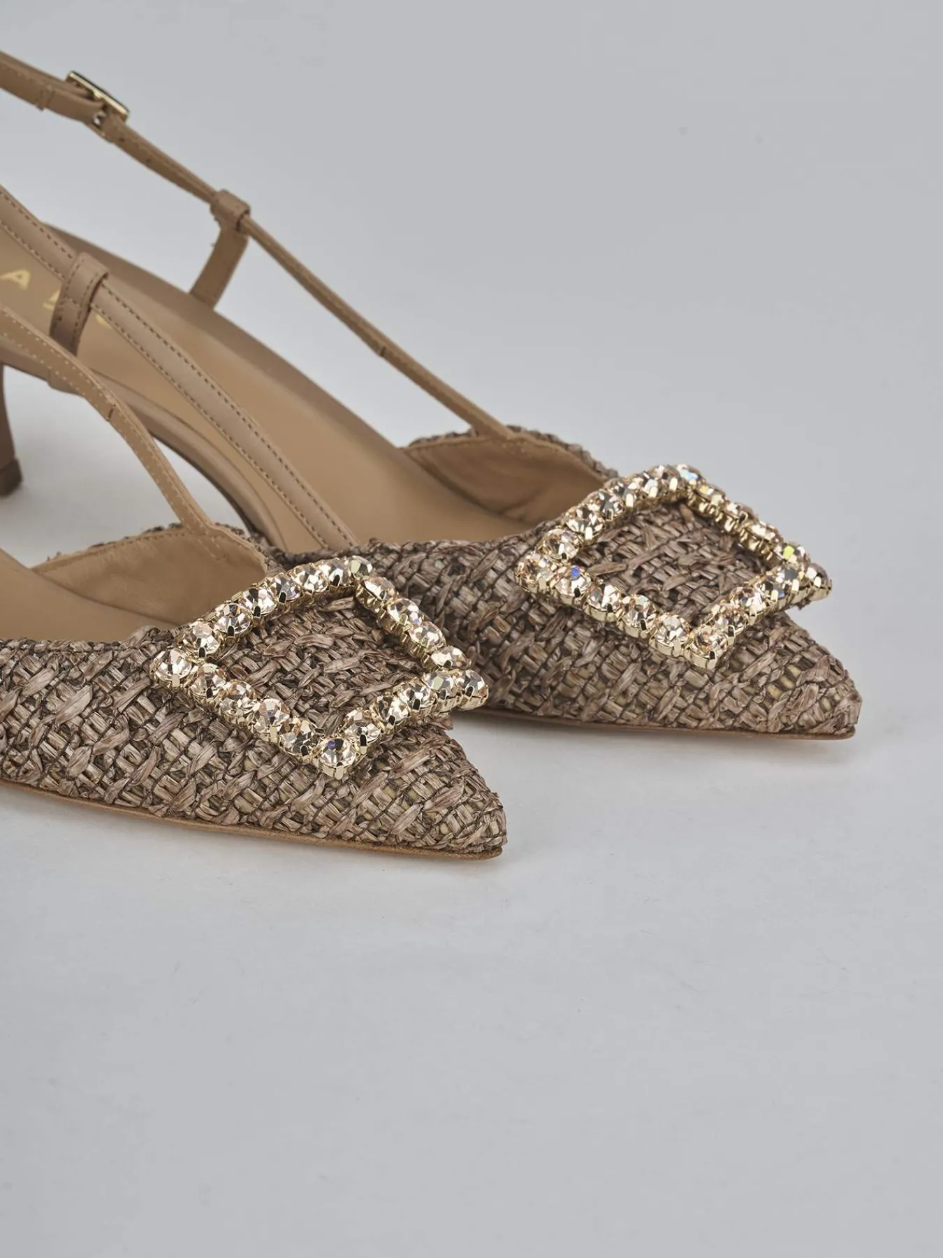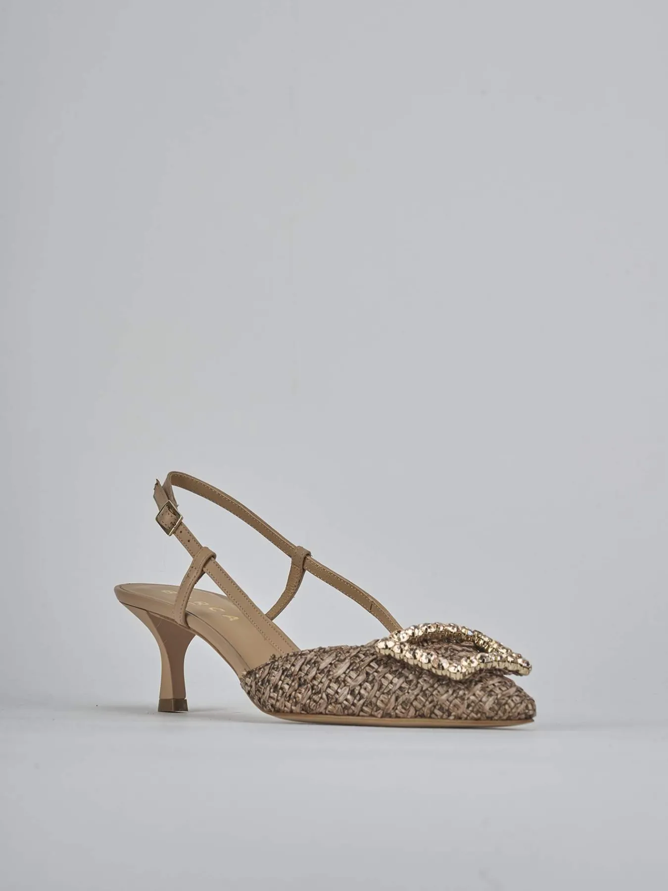 Slingback decolte’ tacco 5 cm fondo in cuoio e soletto interno in vera pelle. Tomaia in morbida pelle foderata con rafia, punta sfilata, scollo morbido a ‘U’, accessorio, cinturino con fibbia regolabile e tacco rocchetto. Perfetto sia con un jeans che con un vestito.