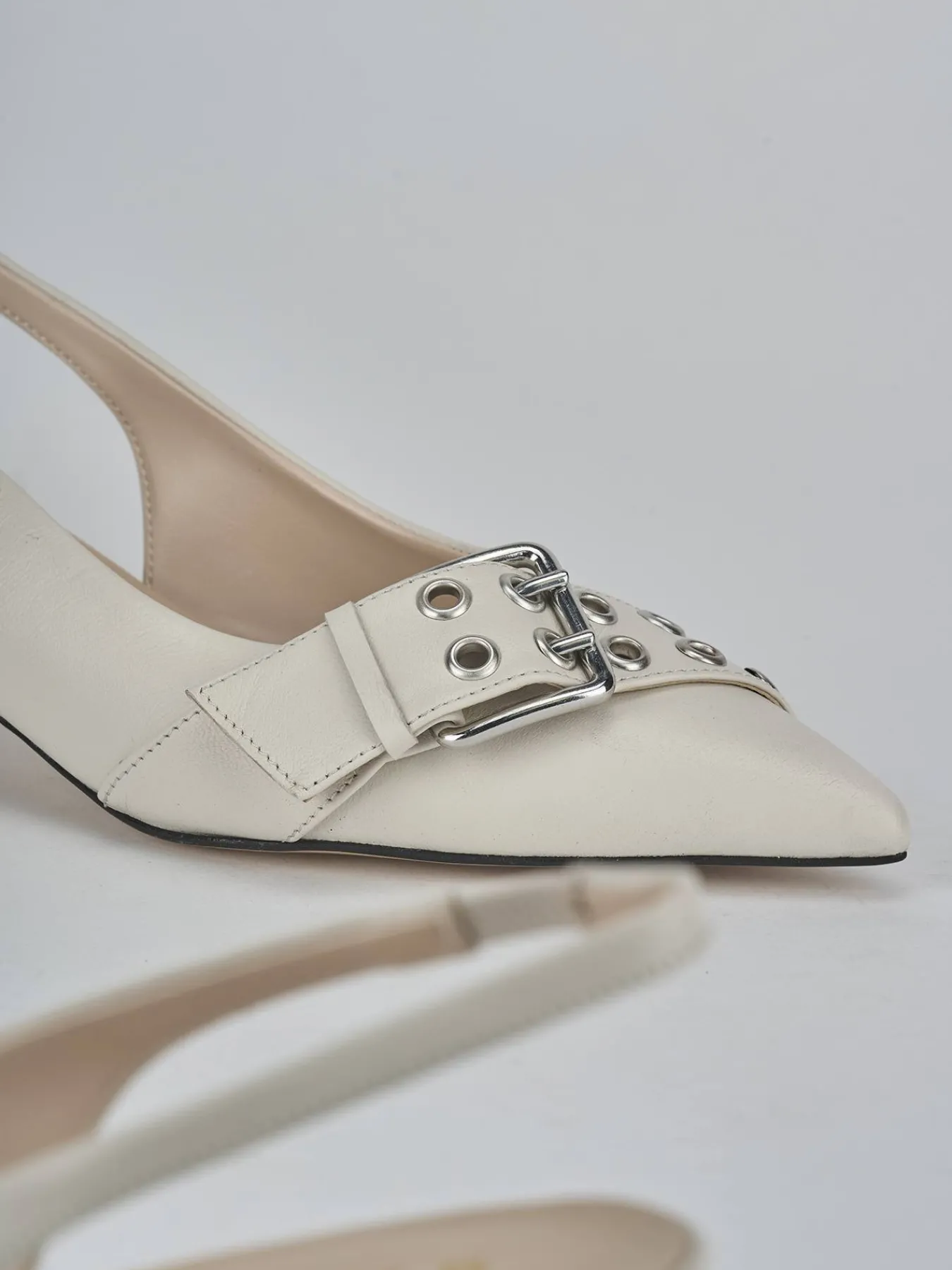Slingback decolte’ tacco 4.5 cm fondo in leggerissima gomma e soletto interno in vera pelle. Tomaia in morbida pelle nappata, punta sfilata, scollo morbido a ‘U’, accessorio a fibbia con borchie forate, cinturino sottile con fibbia regolabile e tacco rocchetto per un look cool.