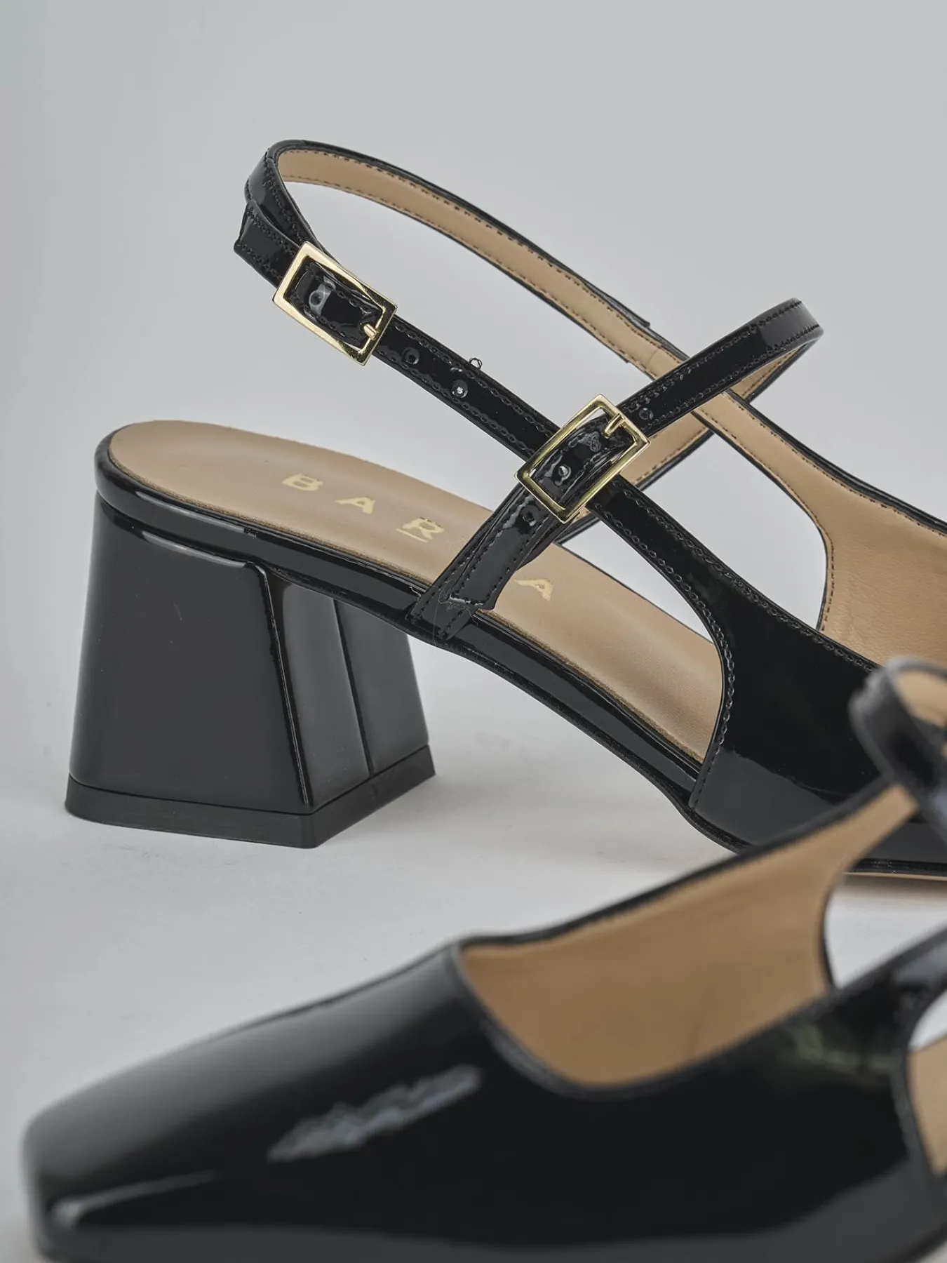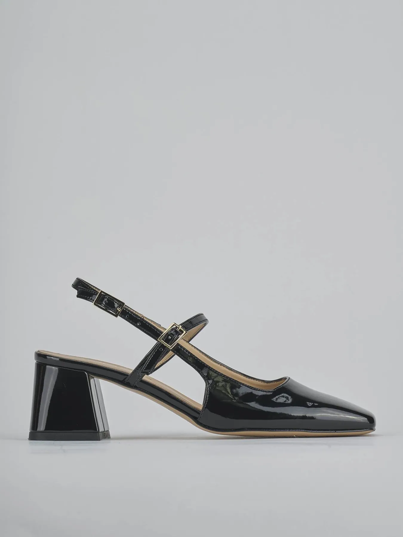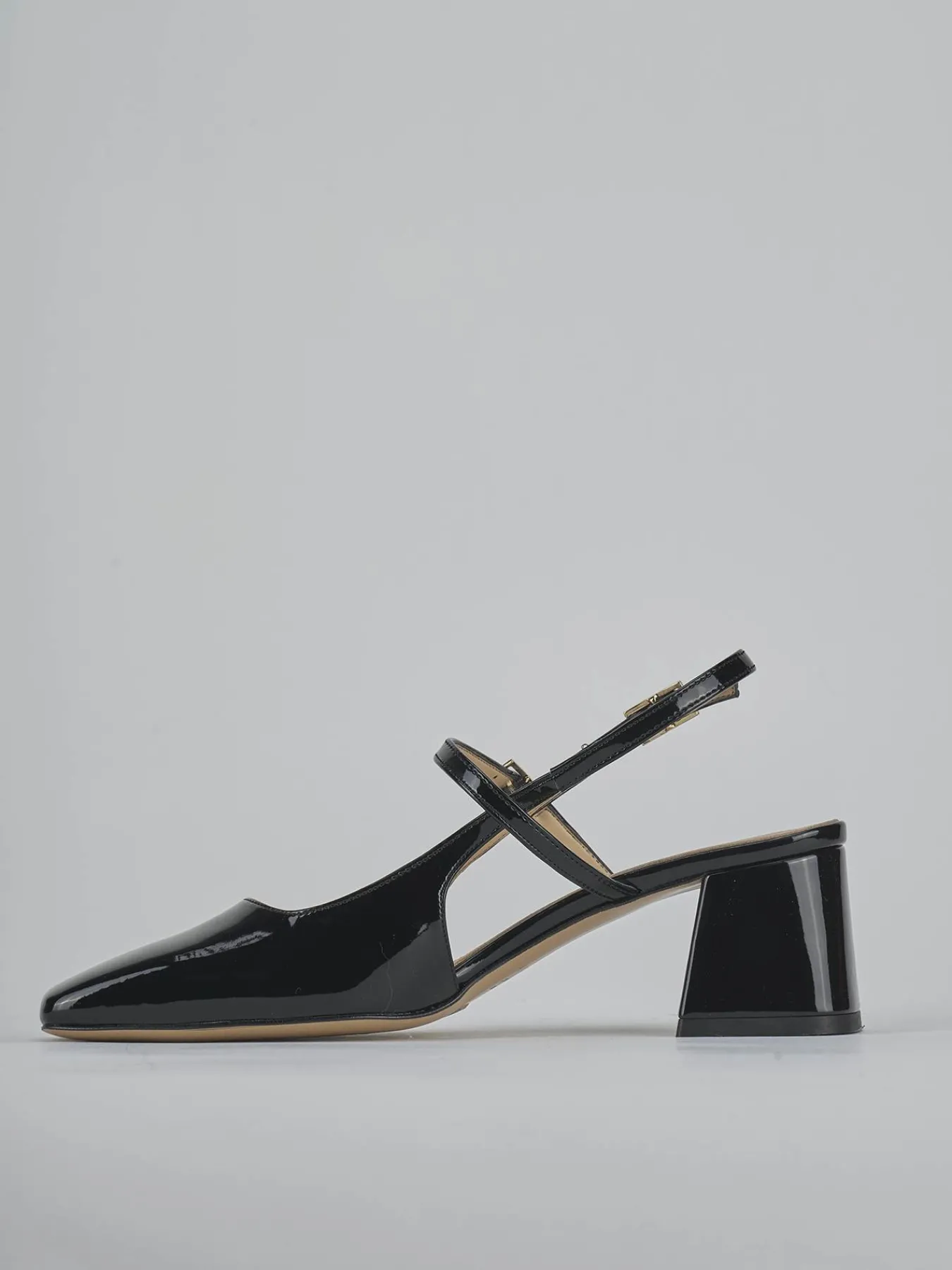 Slingback decolte’ tacco 5 cm fondo in gomma e soletto interno in vera pelle. Tomaia in morbida pelle effetto verniciato, punta squadrata, scollo squadrato, due cinturini con fibbia regolabile e tacco grosso per un look chic.
