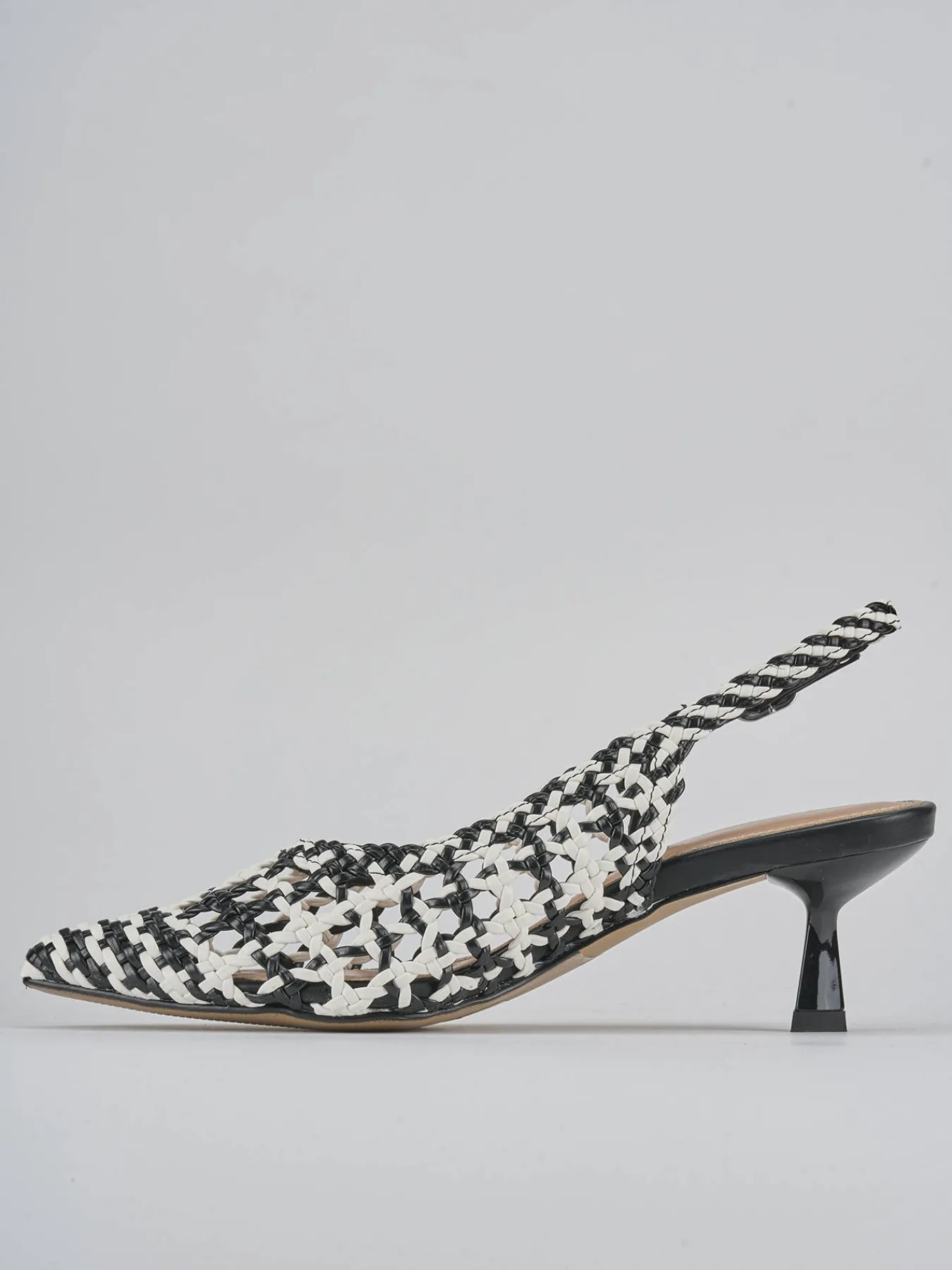 Slingback decolte’ tacco 6 cm fondo in leggerissima gomma e soletto interno in vera pelle. Tomaia in morbida pelle intrecciata, punta sfilata, scollo a ‘U’, cinturino con fibbia regolabile e tacco rocchetto stabile in materiale abs. Versatile sia con un jeans che con un vestito.