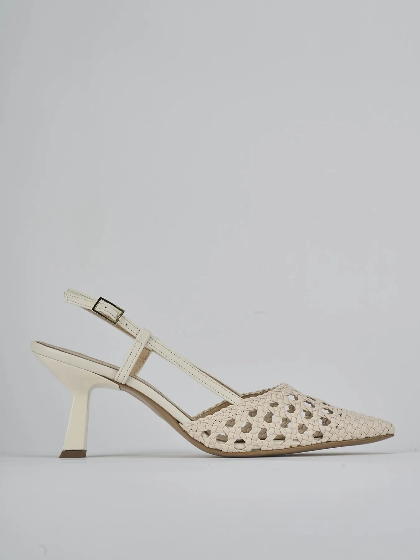 Slingback decolte’ tacco 7 cm fondo in leggerissima gomma e soletto interno in vera pelle. Tomaia in morbida pelle finemente intrecciata, punta sfilata, rete, cinturino con fibbia regolabile e tacco rocchetto per un look chic.