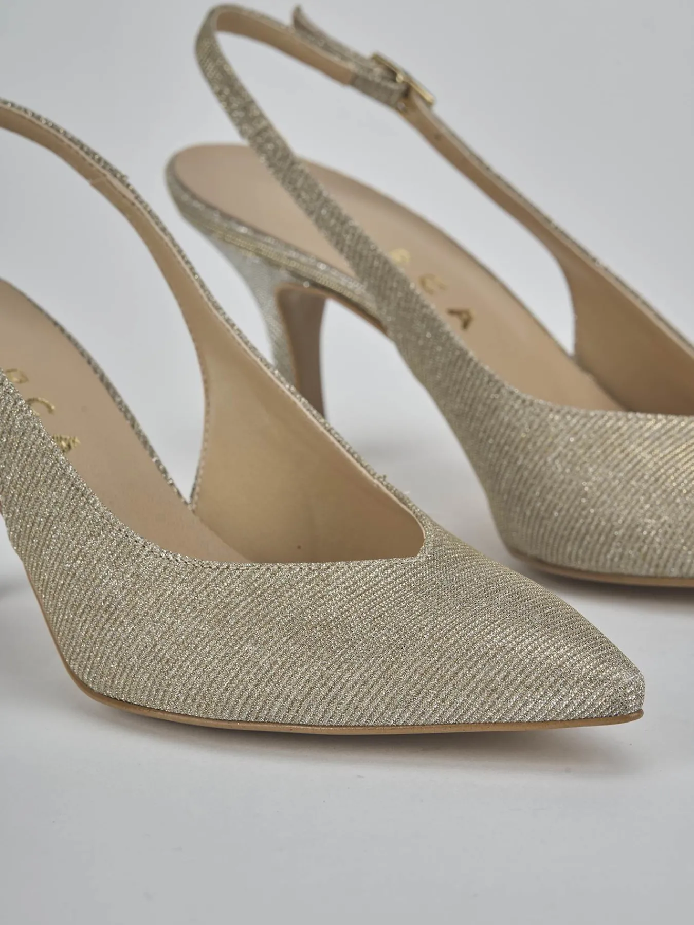 Slingback decolte’ tacco 7 cm fondo in leggerissima gomma e soletto interno in vera pelle. Tomaia in morbida pelle ricoperta in glitter, punta sfilata, scollo a ‘V’, cinturino con fibbia regolabile e tacco rocchetto. Perfetto per le tue occasioni più speciali.