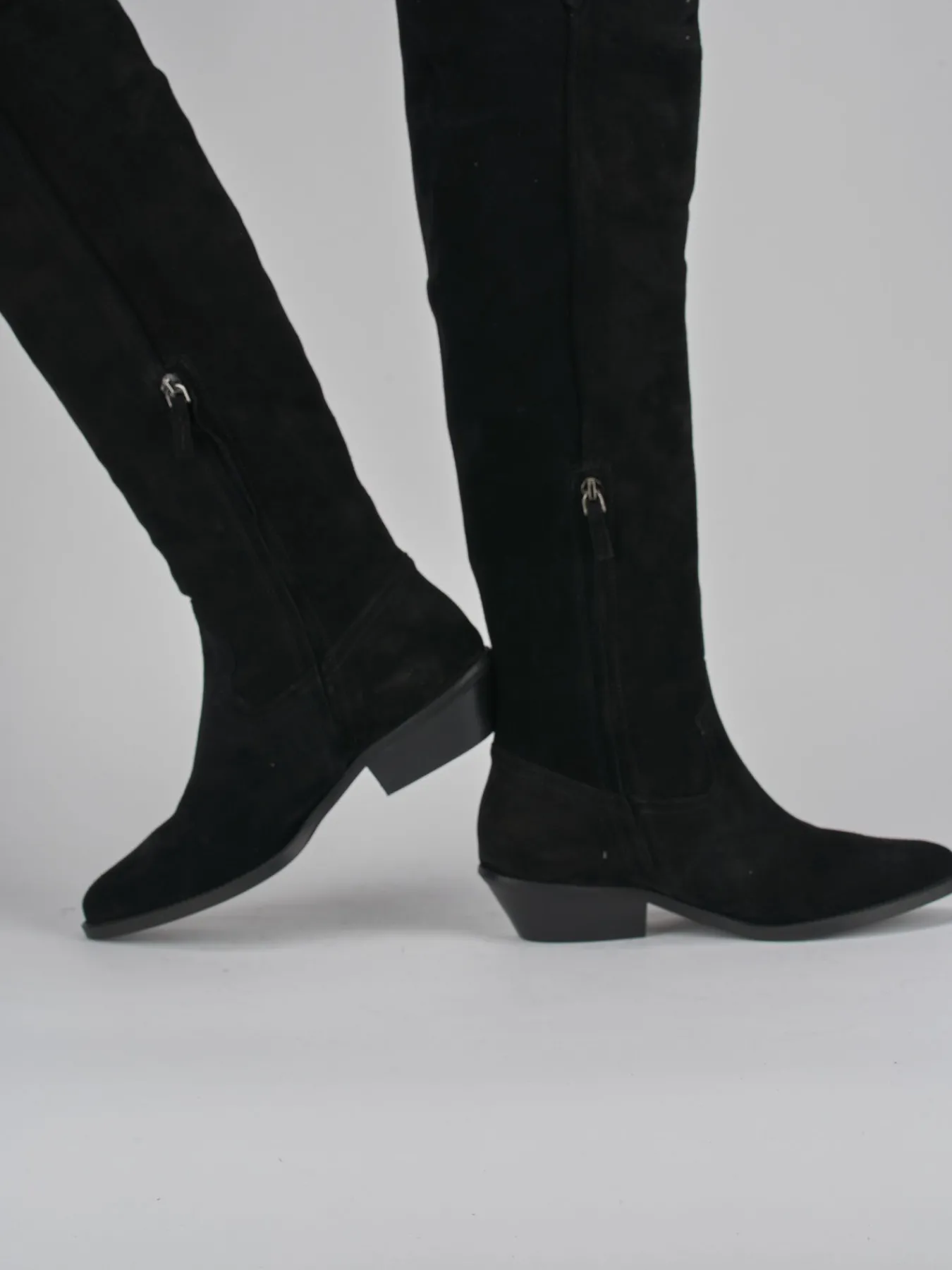Stivale texano tacco 3,5 cm fondo in gomma e soletto interno in vera pelle. Tomaia in morbido camoscio, punta affusolata, comoda cerniera laterale, ghette, cuciture ben visibili e lungo gambale tubolare che misura appena sopra il ginocchio per un look texano cool.