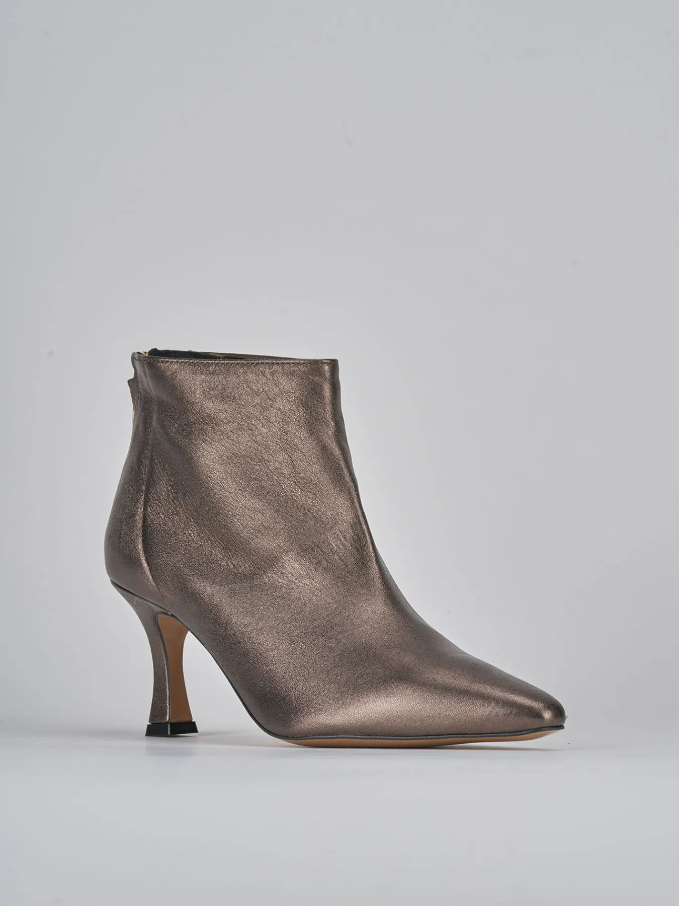 Stivaletto tacco 7 cm fondo in leggera gomma e soletto interno in vera pelle. tomaia in morbida pelle laminata nuances bronzo, punta sfilata, cerniera posteriore e comodissimo tacco rocchetto. dalle linee semplici e pulite modello che dura nel tempo.
