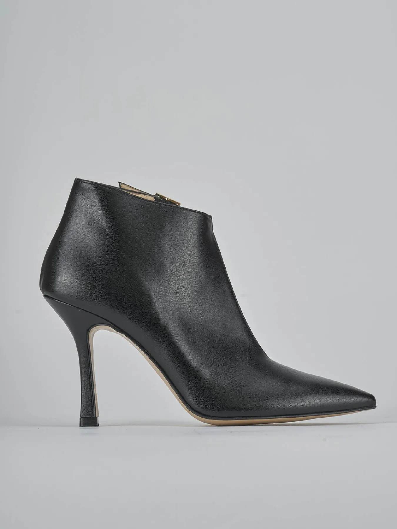 Stivaletto tacco 9 cm fondo in leggerissima gomma e soletto interno in vera pelle. Tomaia in morbida pelle, punta sfilata, aperta lateralmente, cinturino fibbia regolabile e tacco rocchetto per un look cool.