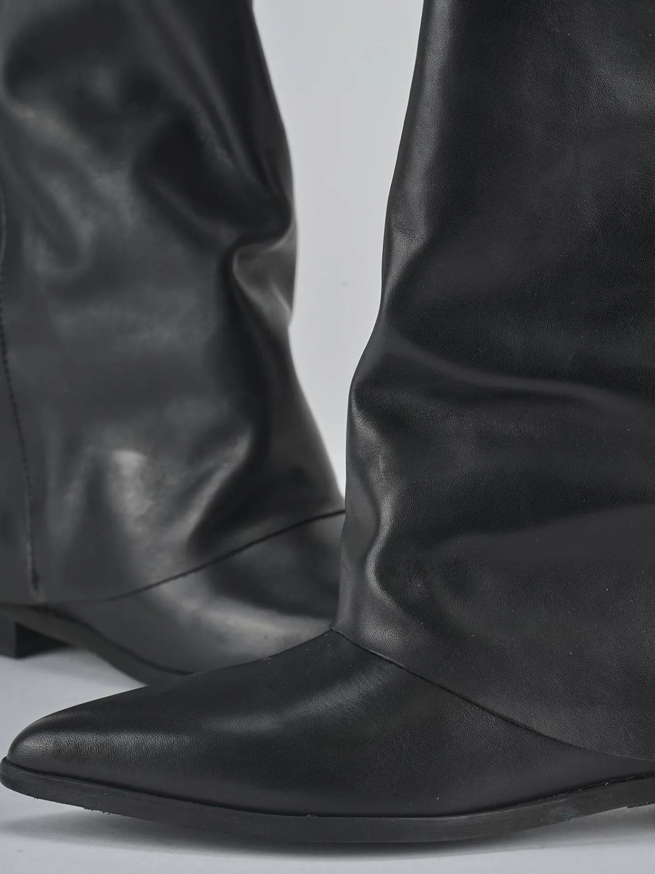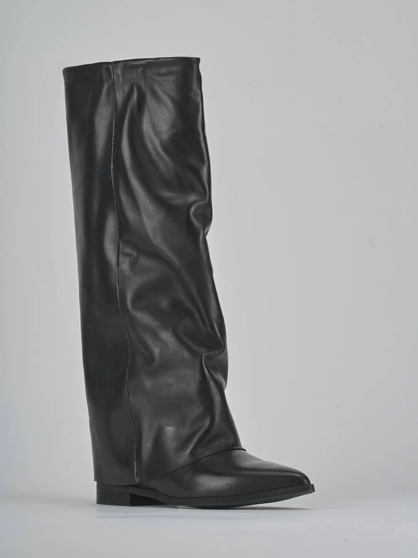 Stivale tacco 2 cm fondo in gomma e soletto interno in vera pelle. Tomaia in morbida pelle, punta sfilata, cuciture a mano, liscio, risvolto sul gambale che misura appena sotto il ginocchio per un look elegante.