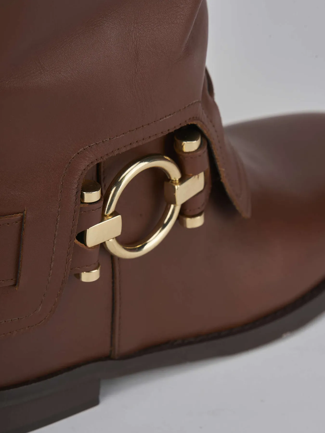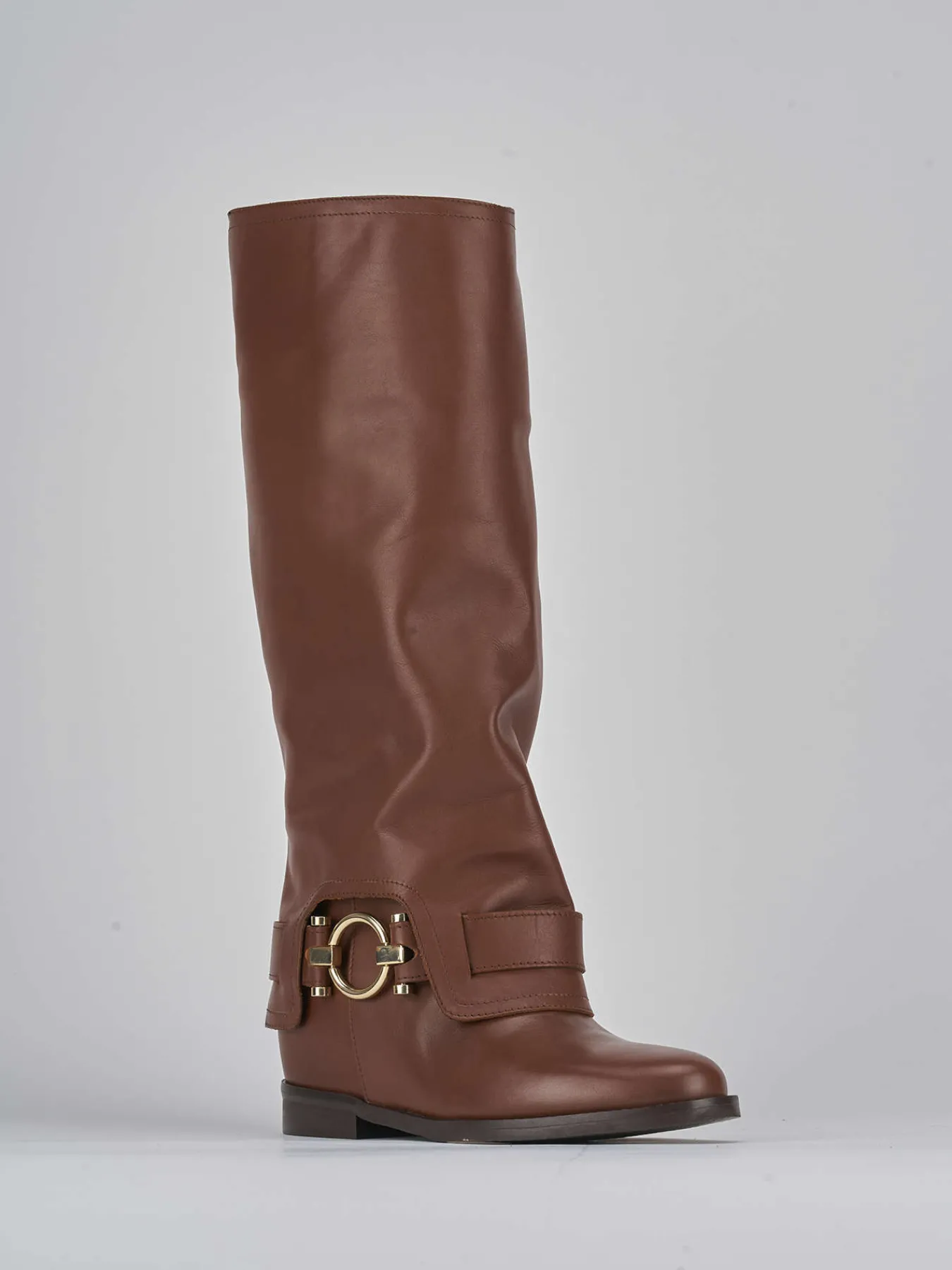 stivale tacco 2 cm fondo in gomma e soletto interno in vera pelle. tomaia in morbida pelle, punta tonda, accessorio in metallo in caviglia, risvolto lungo tutto il gambale che è tubolare e misura appena sotto il ginocchio. zeppa interna di 3 cm. la sua versatilità ti stupirà.