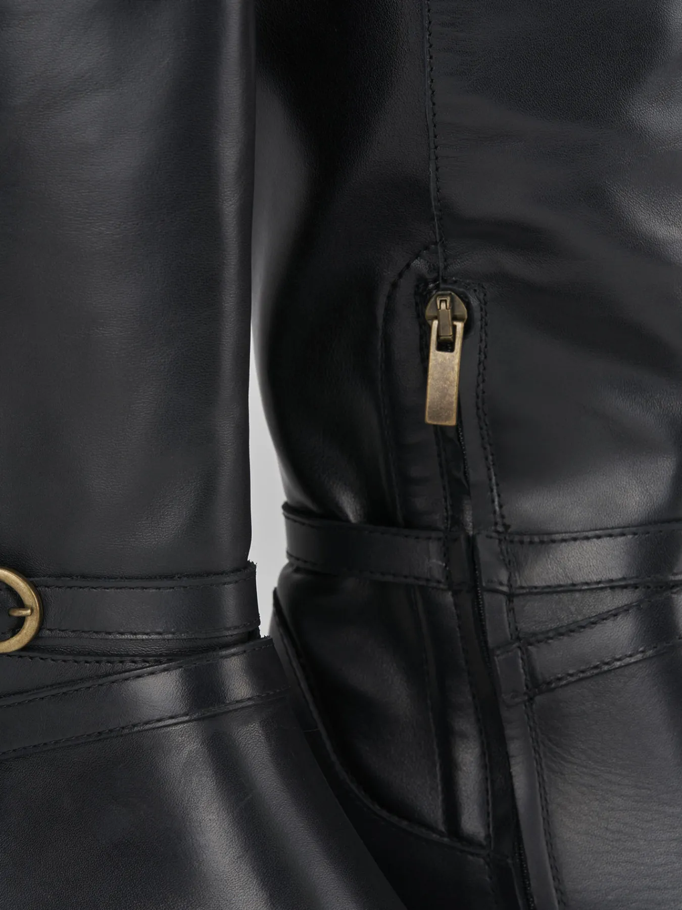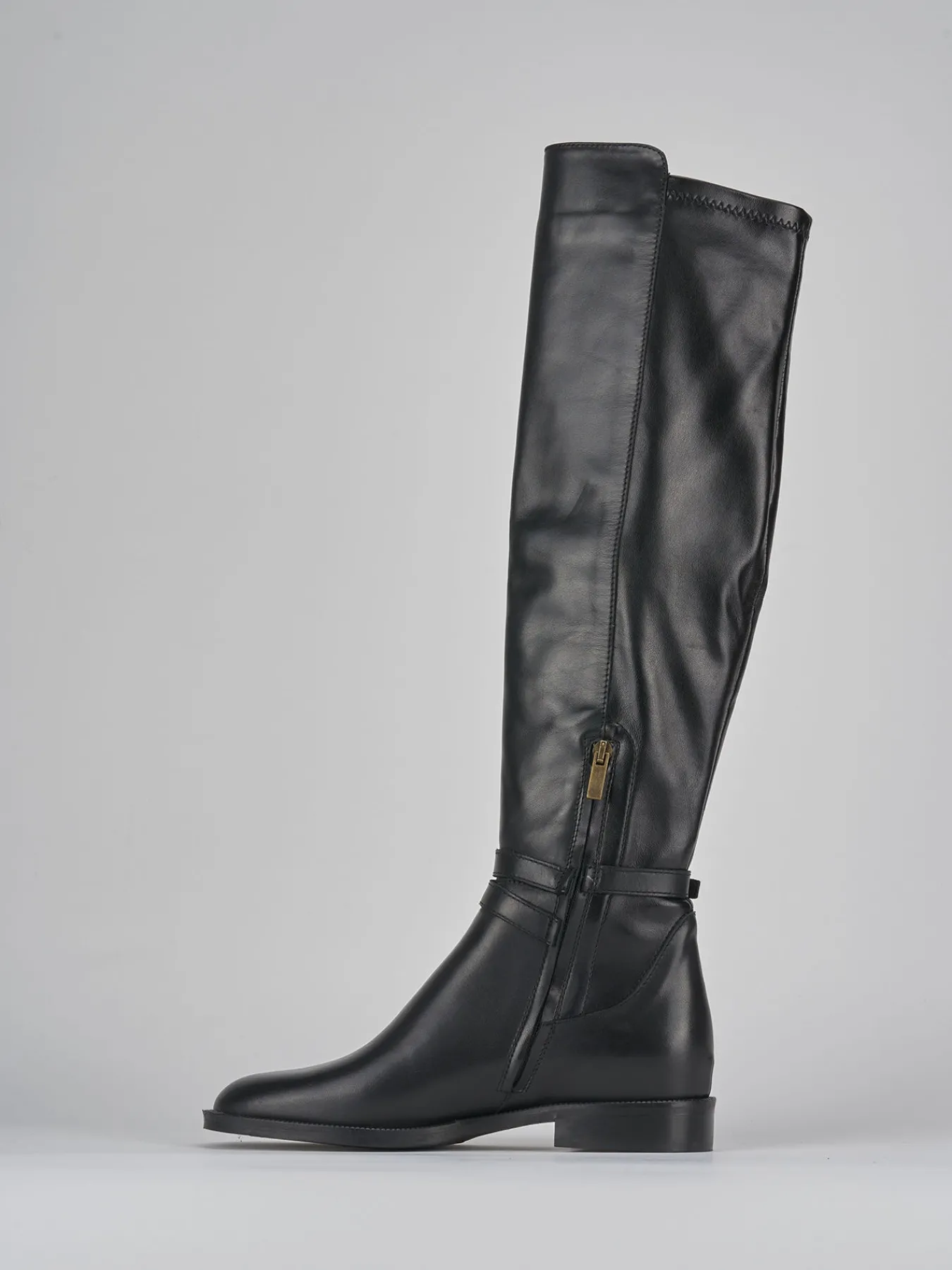 Stivale tacco 2 cm fondo in gomma e soletto interno in vera pelle. Tomaia in morbida pelle, punta tonda, cerniera laterale, cinturino regolabile con fibbia, cuciture sulla tomaia e gambale con pelle elasticizzata posteriormente per un fit unico per te per un look chic.