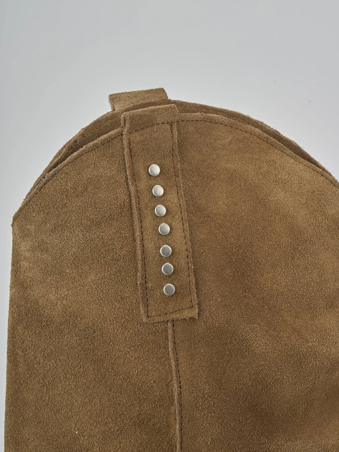 Stivale tacco 7 cm fondo in gomma e soletto interno in vera pelle. Tomaia in morbido camoscio, punta sfilata, risvolto fino al tacco, gambale che arriva a 3/4 del polpaccio, ghette laterali con accessori e tacco cubano. Perfetto con una gonna o un vestito leggero.