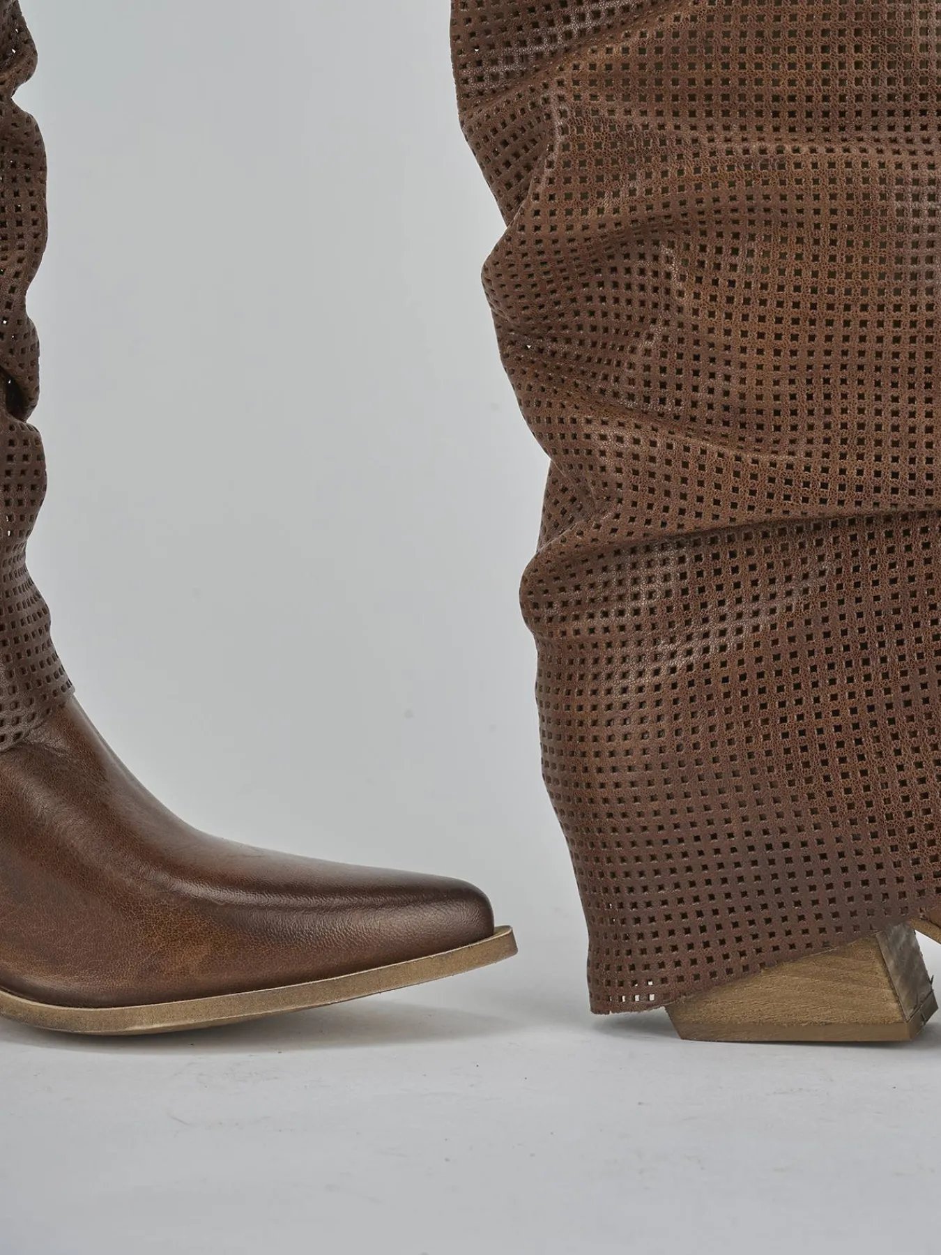 Stivale tacco 7 cm fondo in gomma e soletto interno in vera pelle. Tomaia in morbido camoscio, punta sfilata, forato, ghette che mantengono la forma del gambale che misura a 3/4 del polpaccio. Tacco cubano per una camminata sicura.