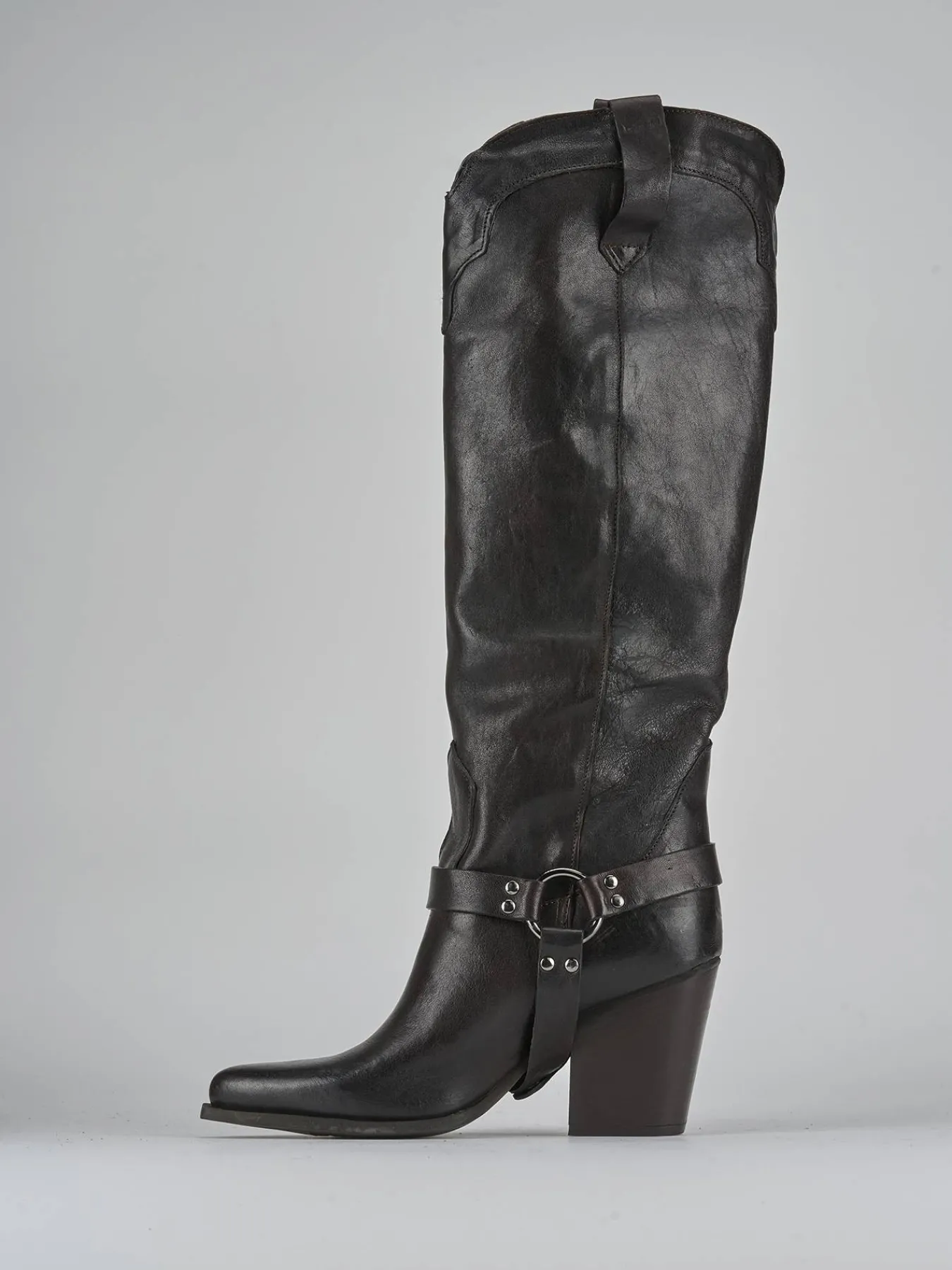 La punta sfilata e le cuciture a mano sul gambale, che arriva appena sotto il ginocchio, donano un look sofisticato e alla moda.