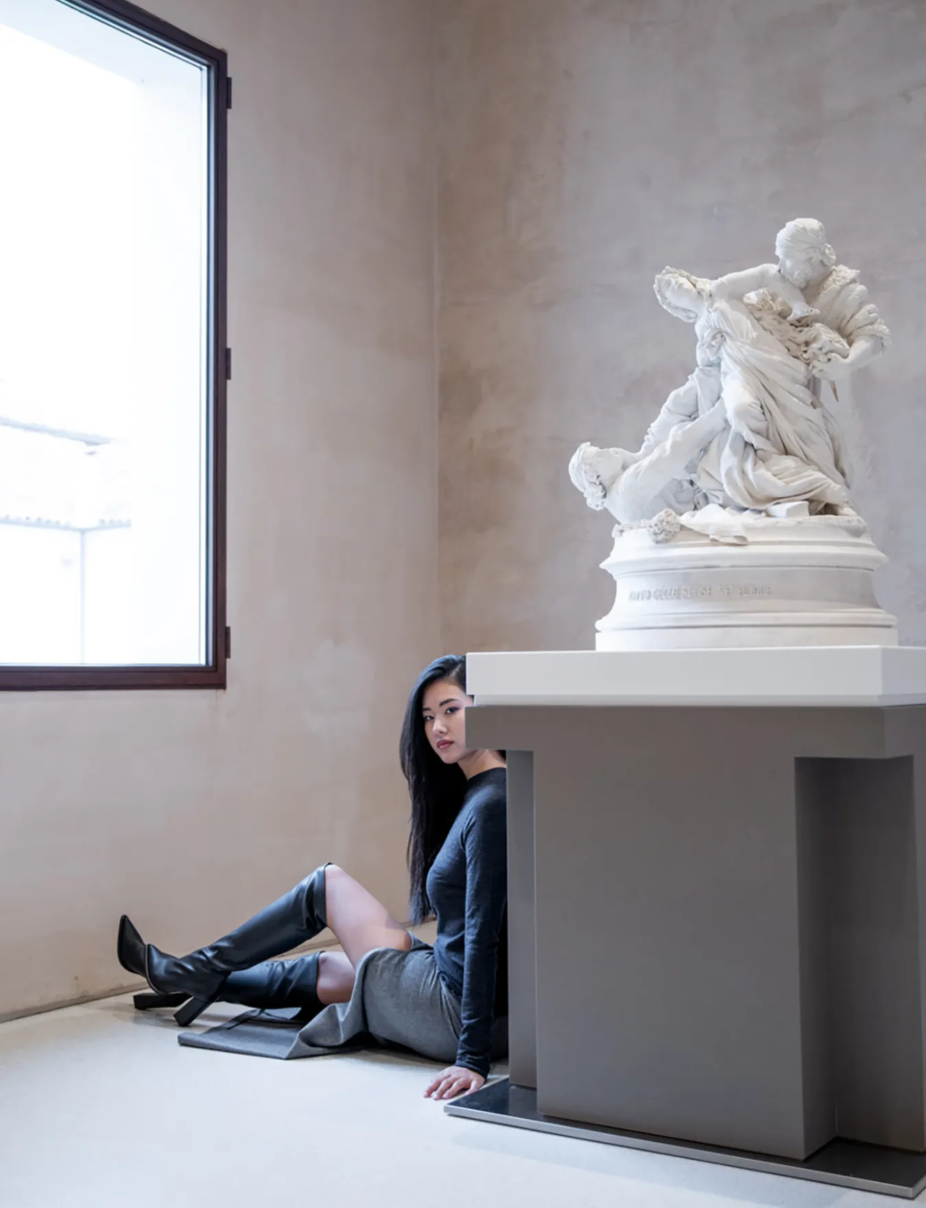 stivale tacco 9 cm fondo in leggera gomma e soletto interno in vera pelle. tomaia in morbida pelle stretch, punta sfilata, cuciture a vista, gambale aderente che misura appena sopra il ginocchio. guardolo sporgente per un look edgy.