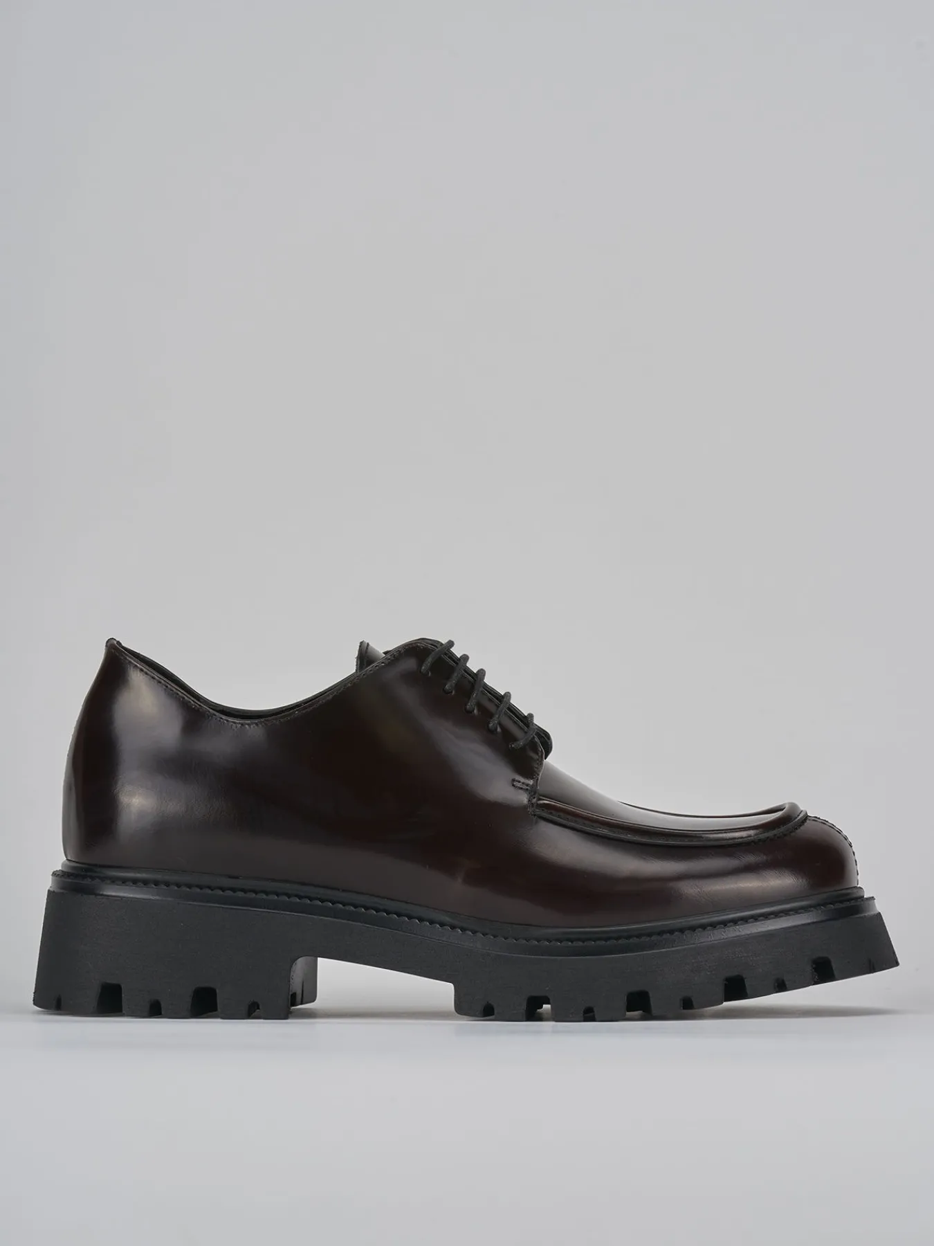 Stringata tacco 2 cm fondo in gomma e soletto interno in vera pelle. Tomaia in morbida pelle effetto lucido, punta squadrata, lace, cuciture visibili e alla norvegese e particolare fondo seghettato per una scarpa versatile dall’anima sporty-chic.