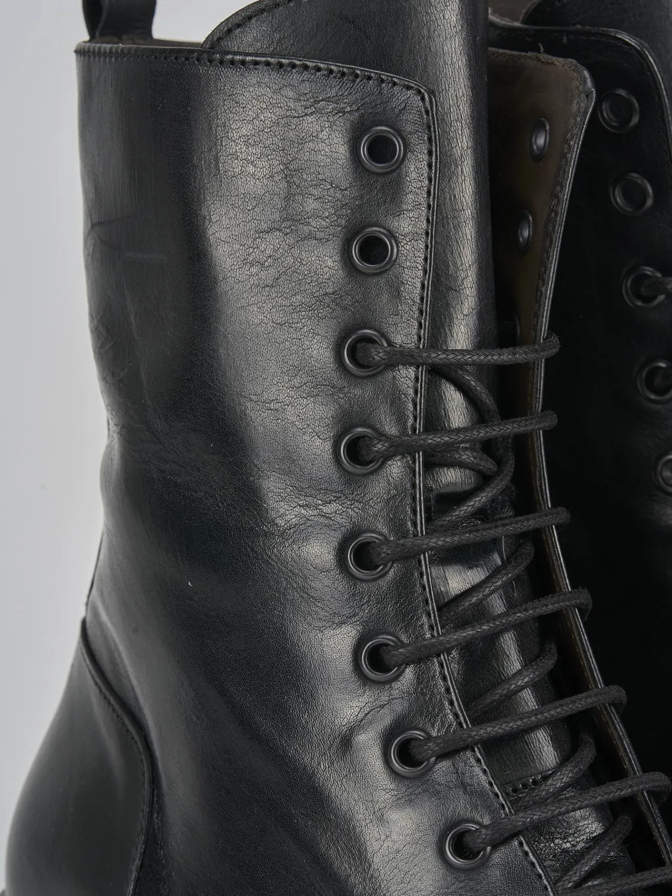 La tomaia in pelle nera avvolge il piede con classe, mentre l’allacciatura alta a 9 buchi garantisce una calzata perfetta fino alla caviglia.