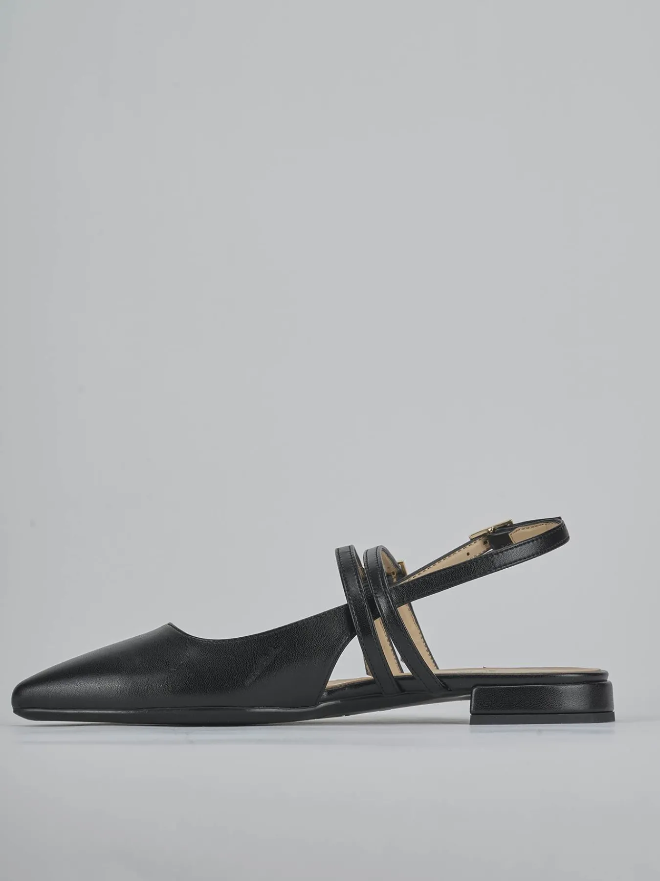 Ballerina tacco 2 cm fondo in leggerissima gomma e soletto interno in vera pelle. Tomaia in morbida pelle, punta sfilata, scollo leggermente squadrato, due cinturini sul collo del piede e uno sul tallone con fibbia regolabile per un look semplice ma elegante.