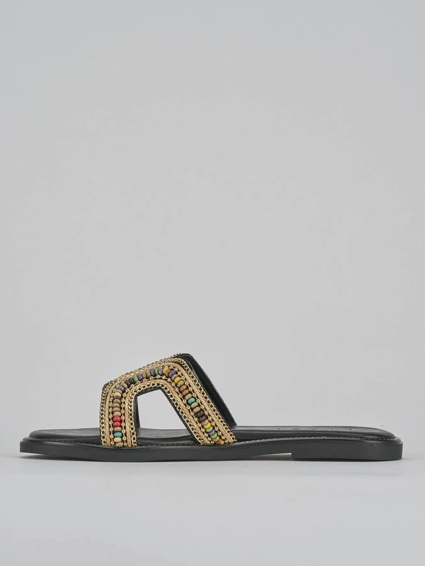 La tomaia è impreziosita da una fascia unica decorata con pietre colorate, aggiungendo un tocco di eleganza easychic al tuo outfit quotidiano.
