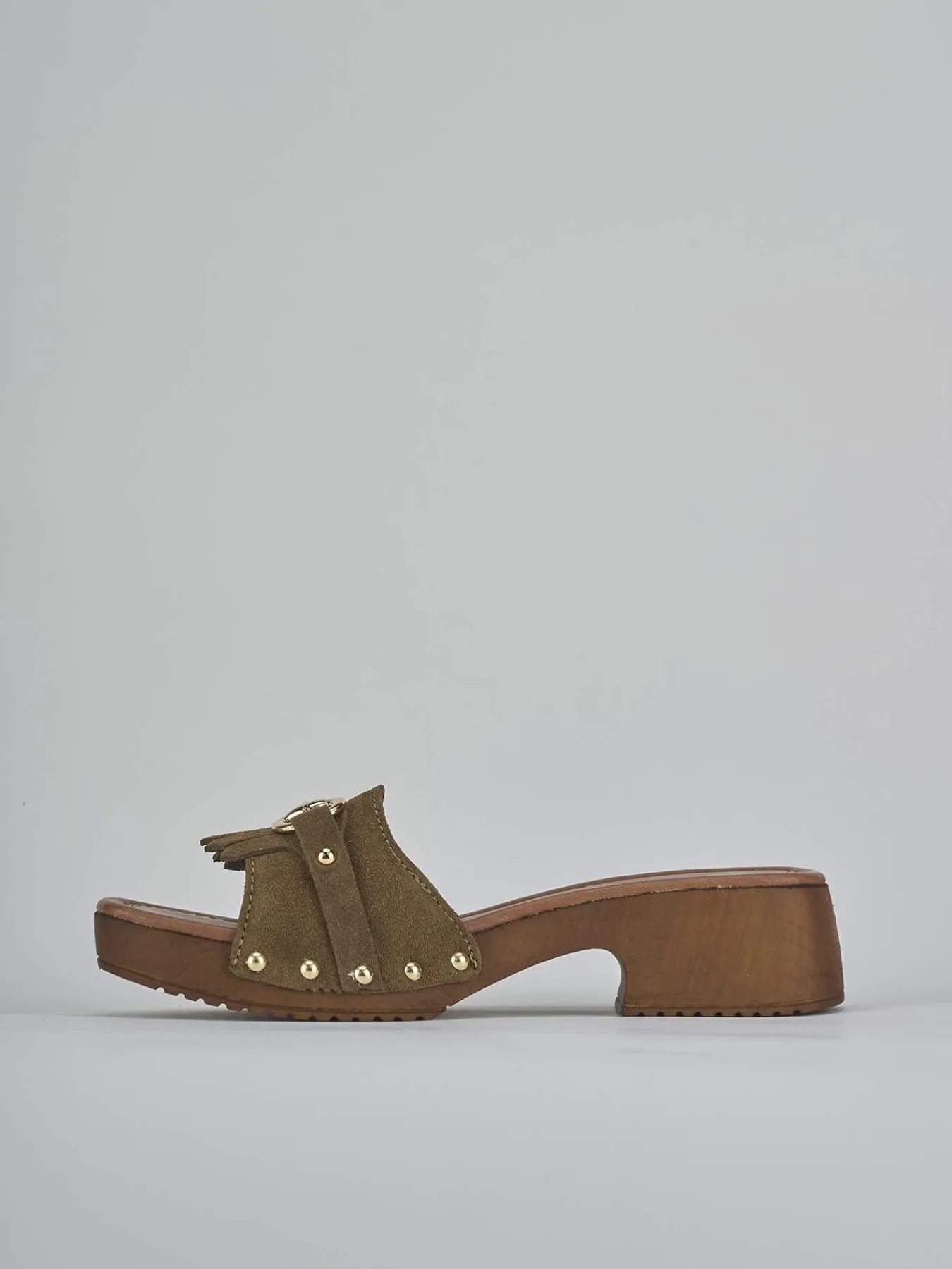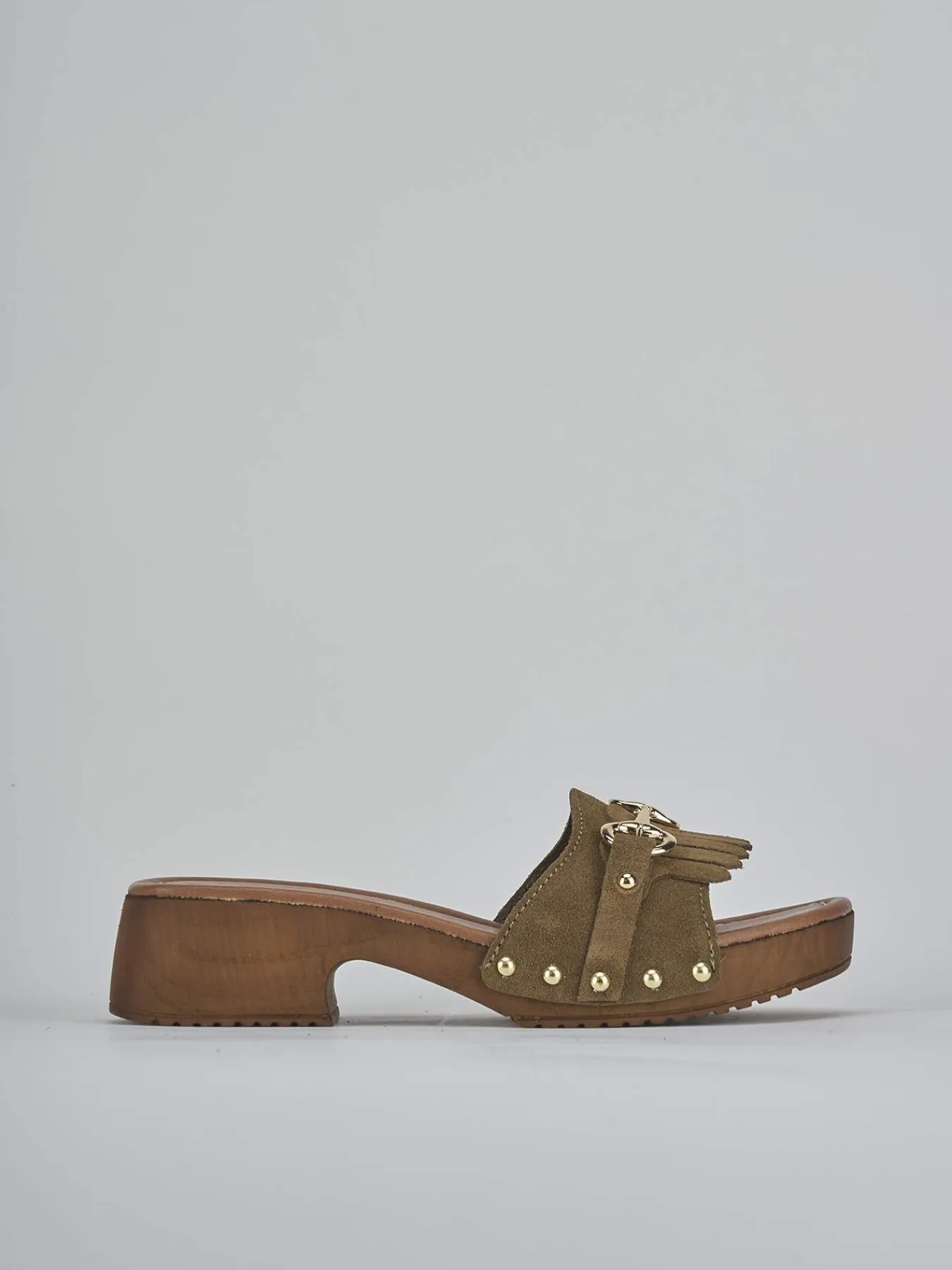 Ciabatta tacco 3 cm fondo in gomma e soletto interno in vera pelle. Tomaia in morbido camoscio, punta squadrata, fascia unica in punta con frange e morsetto, borchie laterali e tacco stabile per un look chic. Piccolo plateau anteriore di 1 cm.