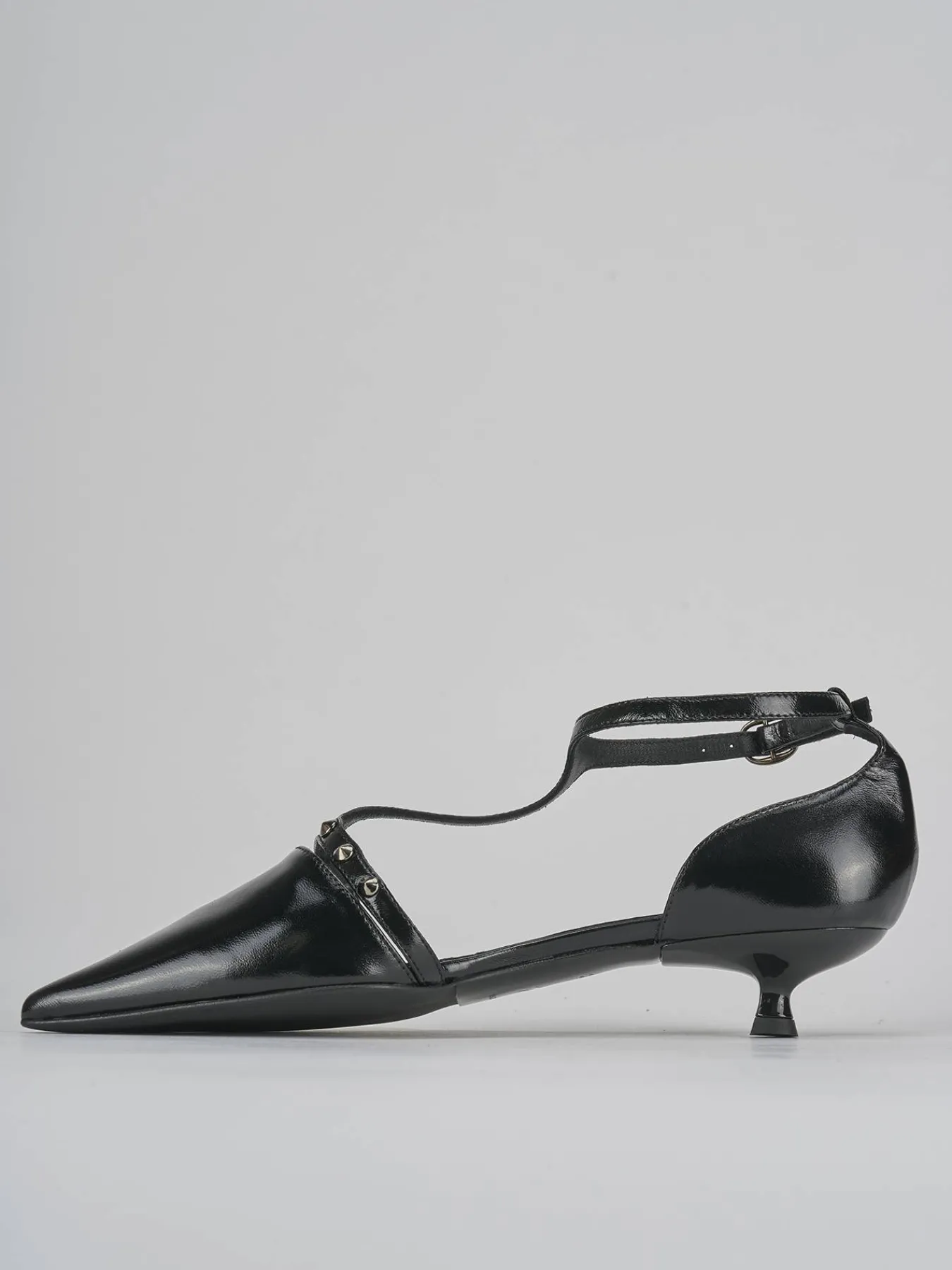 La punta sfilata e aperta lateralmente con cinturino a ‘T’ aggiunge un dettaglio chic e sofisticato.