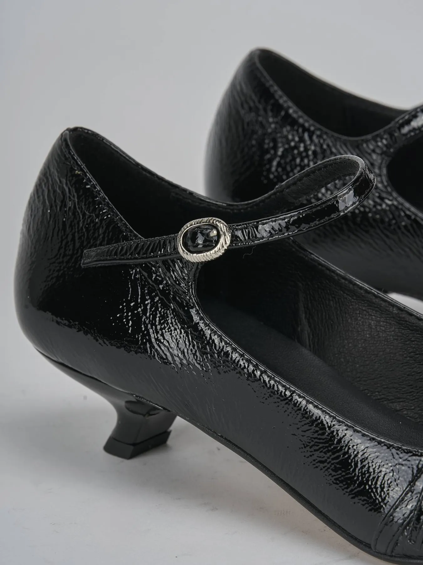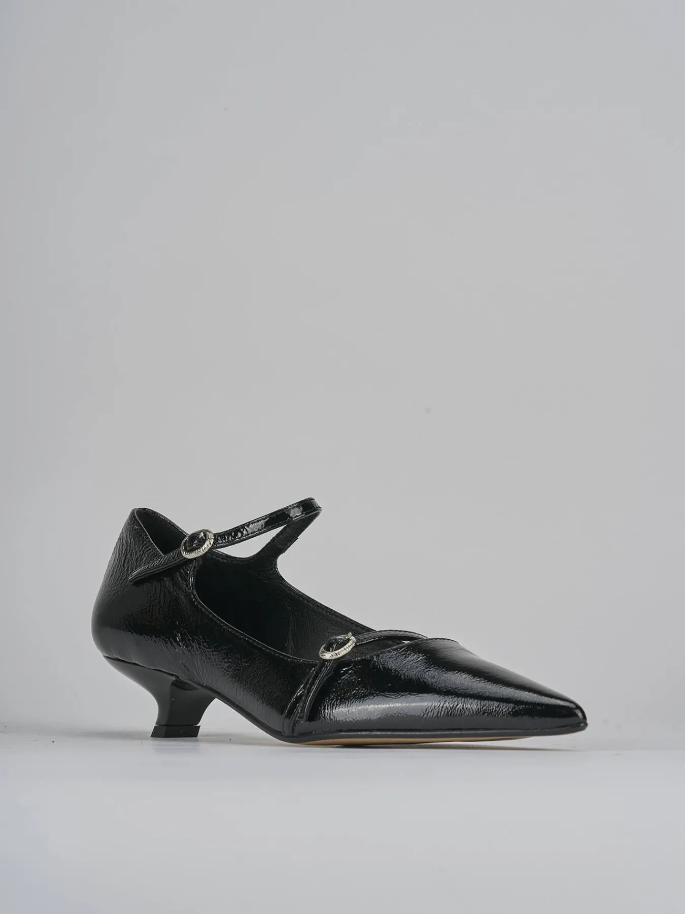La tomaia in morbida pelle effetto verniciato dona un aspetto lucido e raffinato, mentre la punta sfilata e lo scollo dolce a ‘U’ esaltano la femminilità della scarpa.
