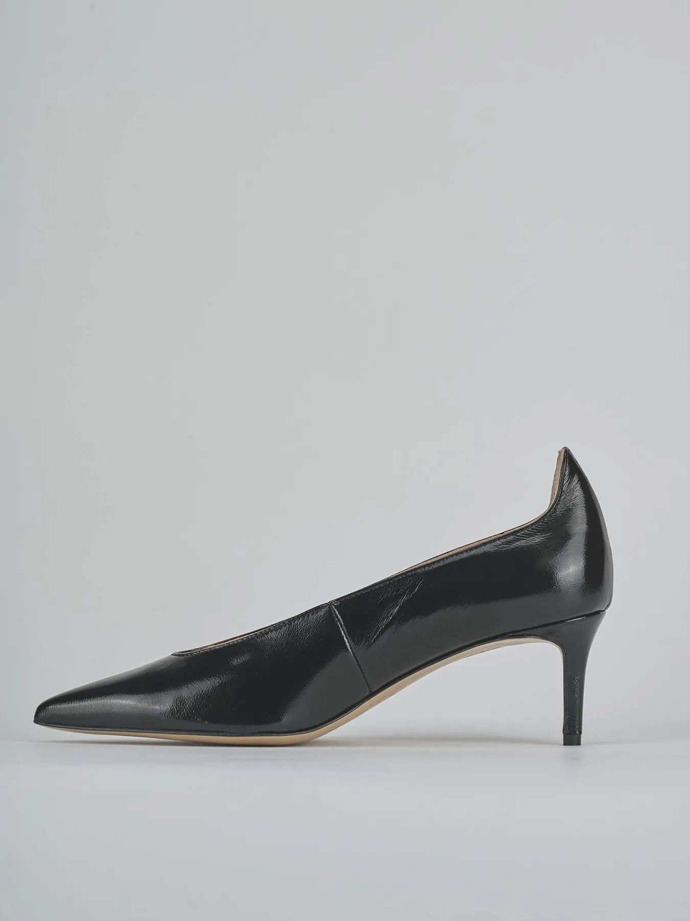 La tomaia è realizzata in morbida pelle con un effetto verniciato che cattura lo sguardo, mentre la punta sfilata e lo scollo a ‘U’ profondo e accollato esaltano il design sofisticato.