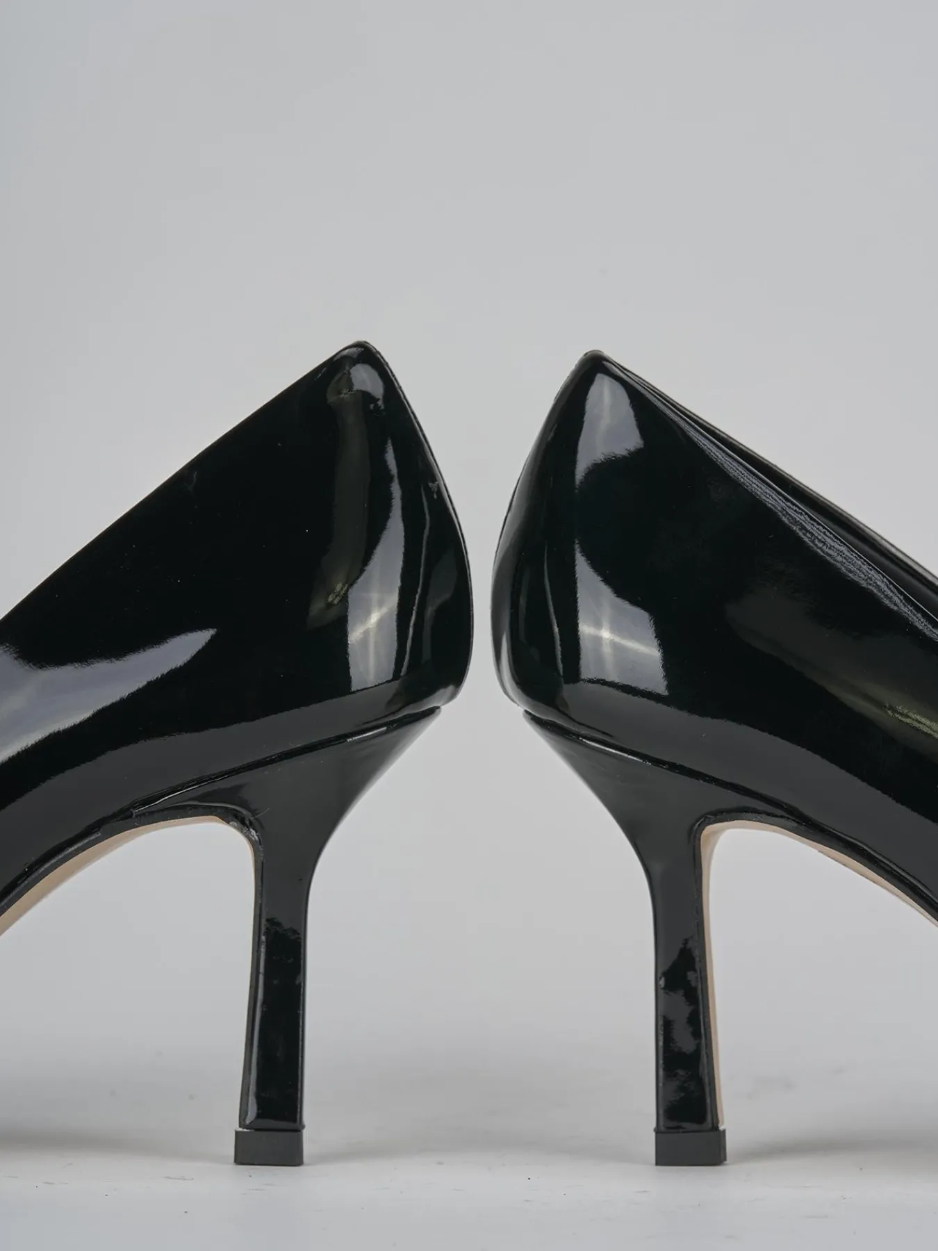 La tomaia in morbida pelle effetto verniciato dona un look sofisticato e moderno, mentre la punta sfilata e lo scollo squadrato aggiungono un dettaglio chic e ricercato.