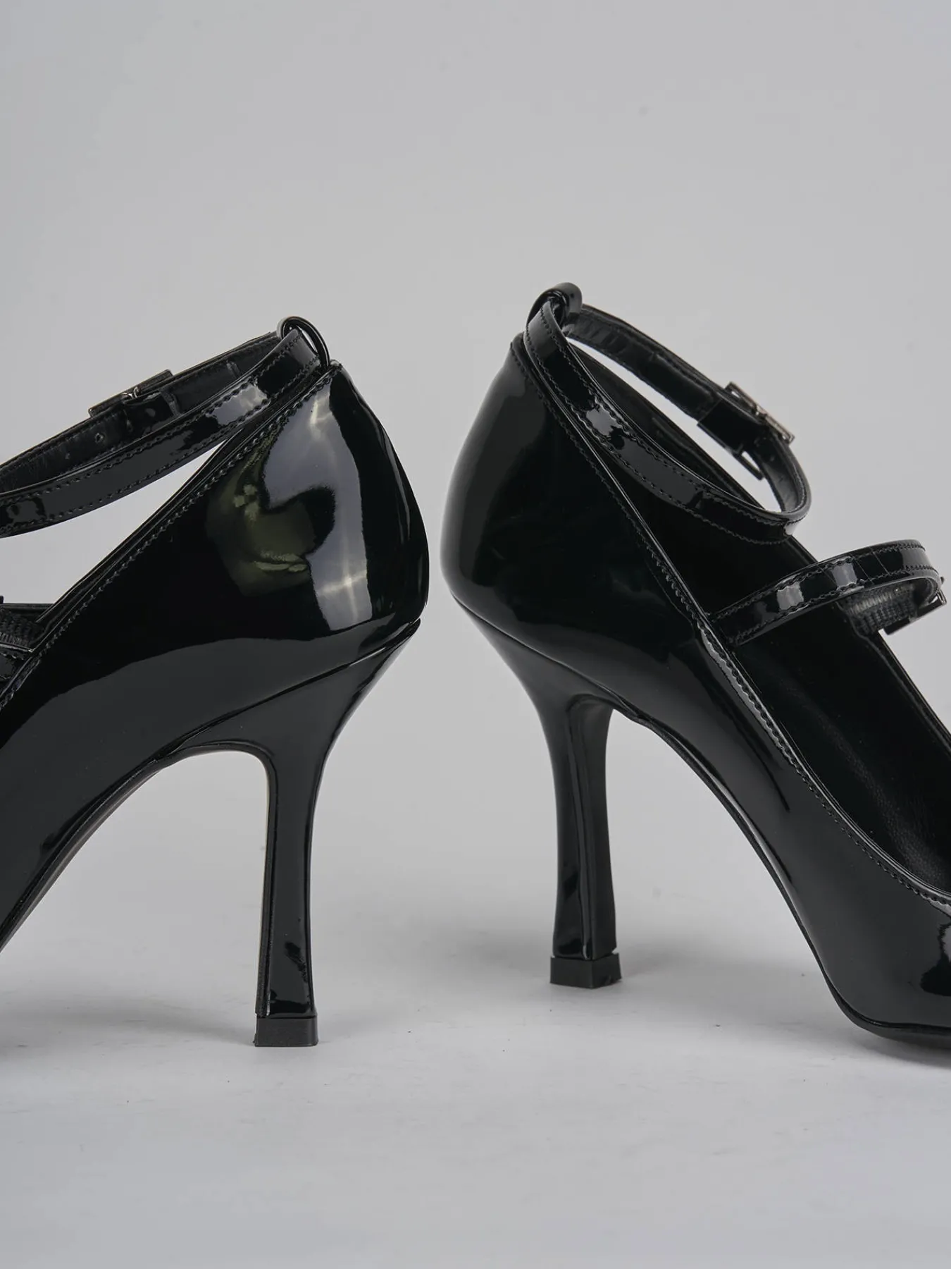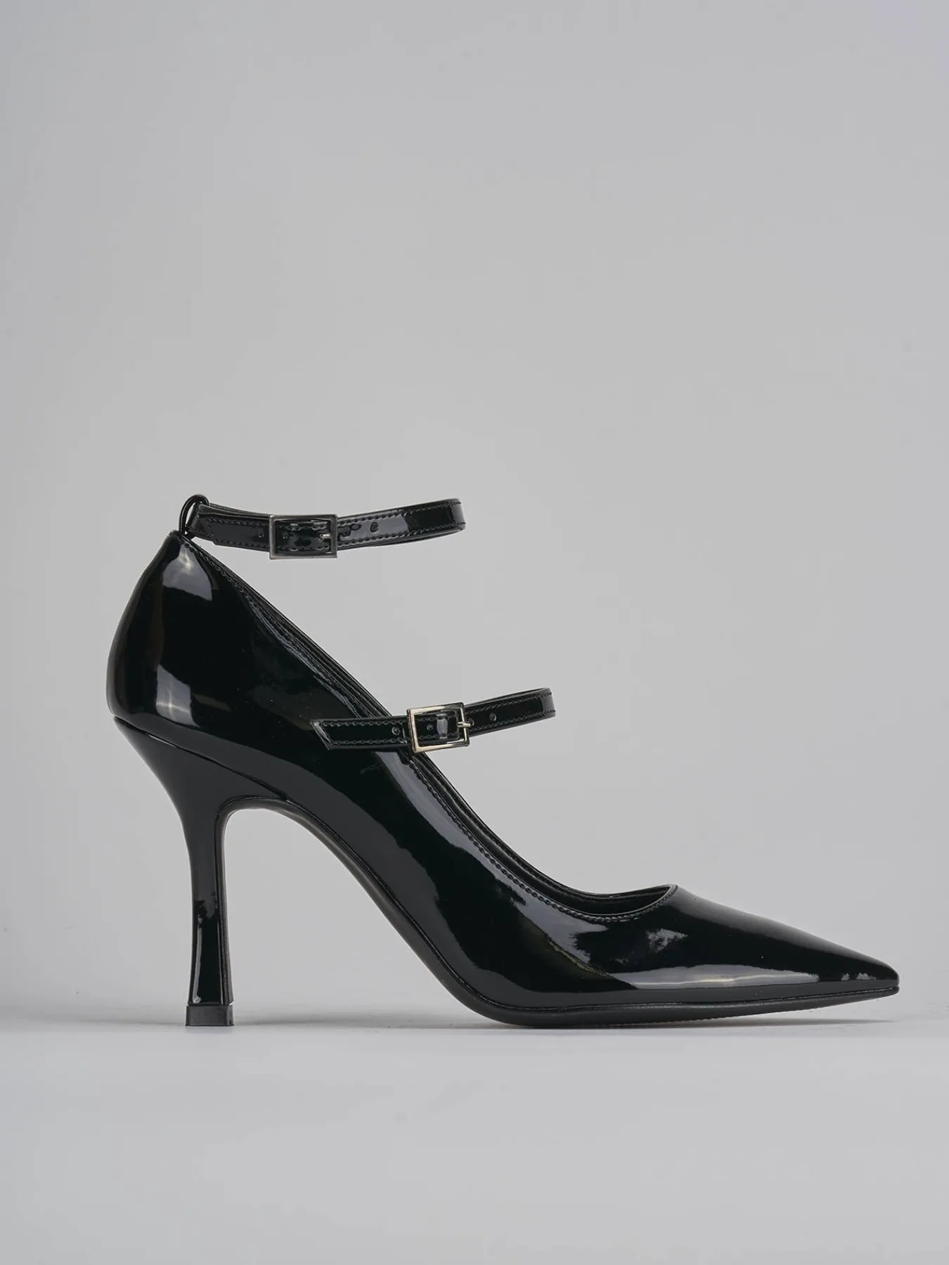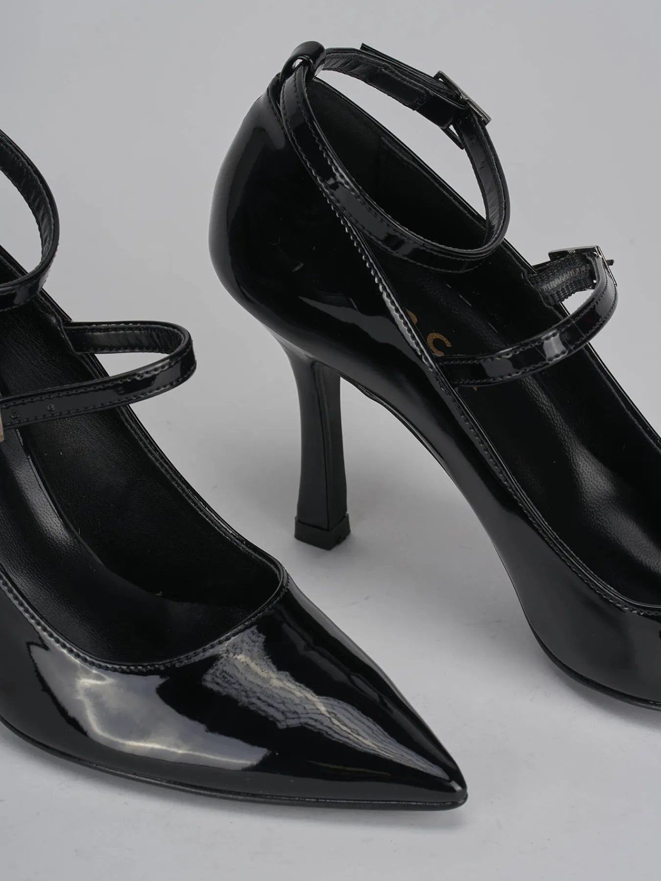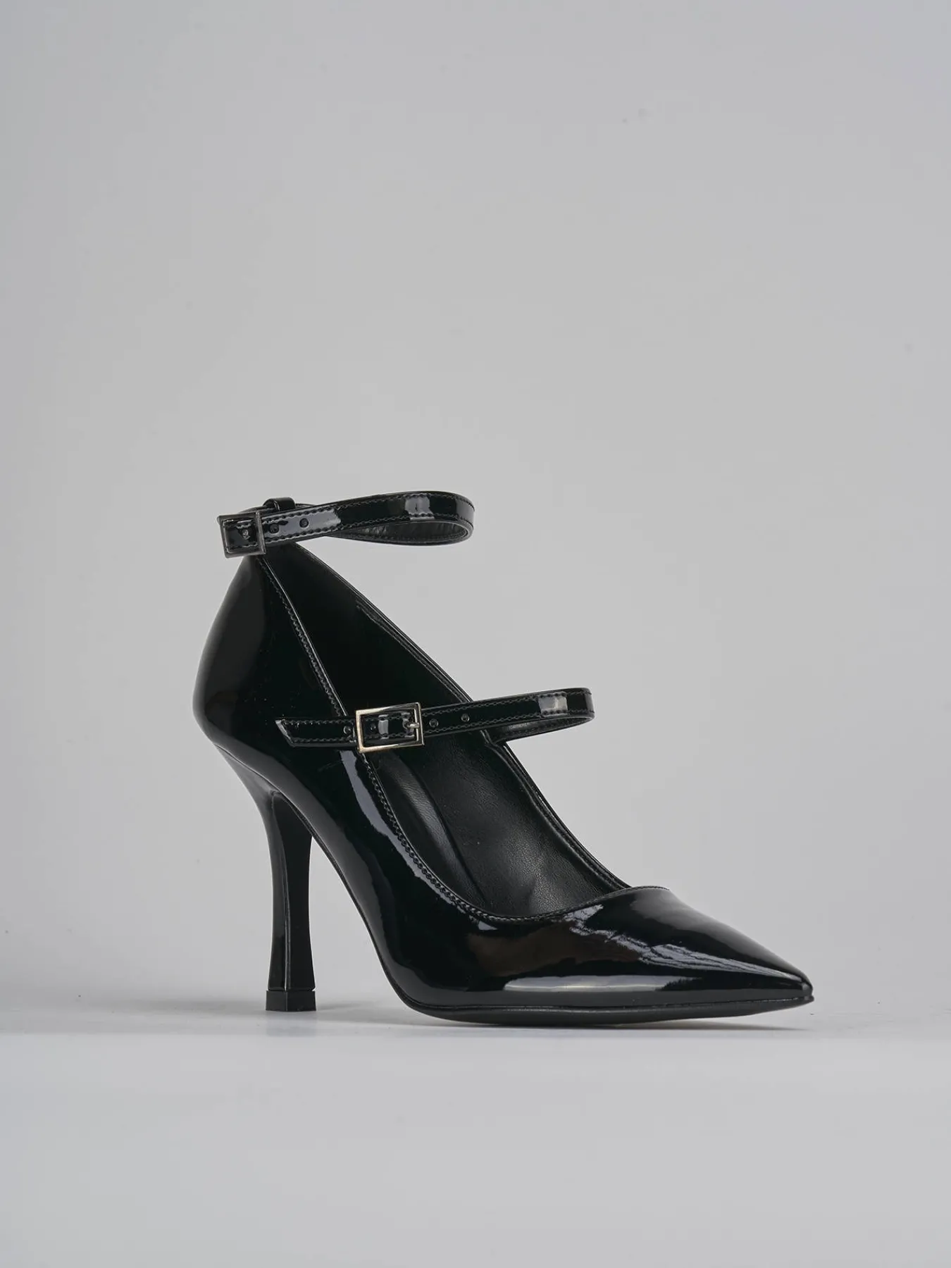 bebe’ tacco 9 cm fondo in leggera gomma e soletto interno in vera pelle. tomaia in morbida pelle effetto verniciato, punta sfilata, due cinturini con fibbia regolabile e tacco rocchetto. perfetto con un jeans e una camicia vintage.