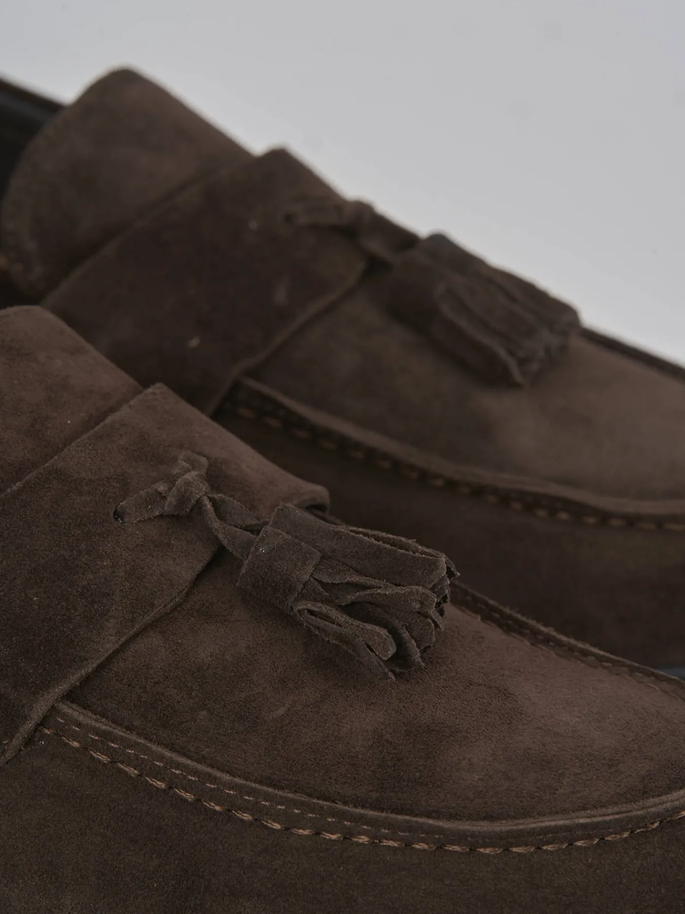 Realizzati in morbido camoscio, questi mocassini offrono una punta leggermente squadrata, impreziosita da cuciture a mano a vista e nappine eleganti.
