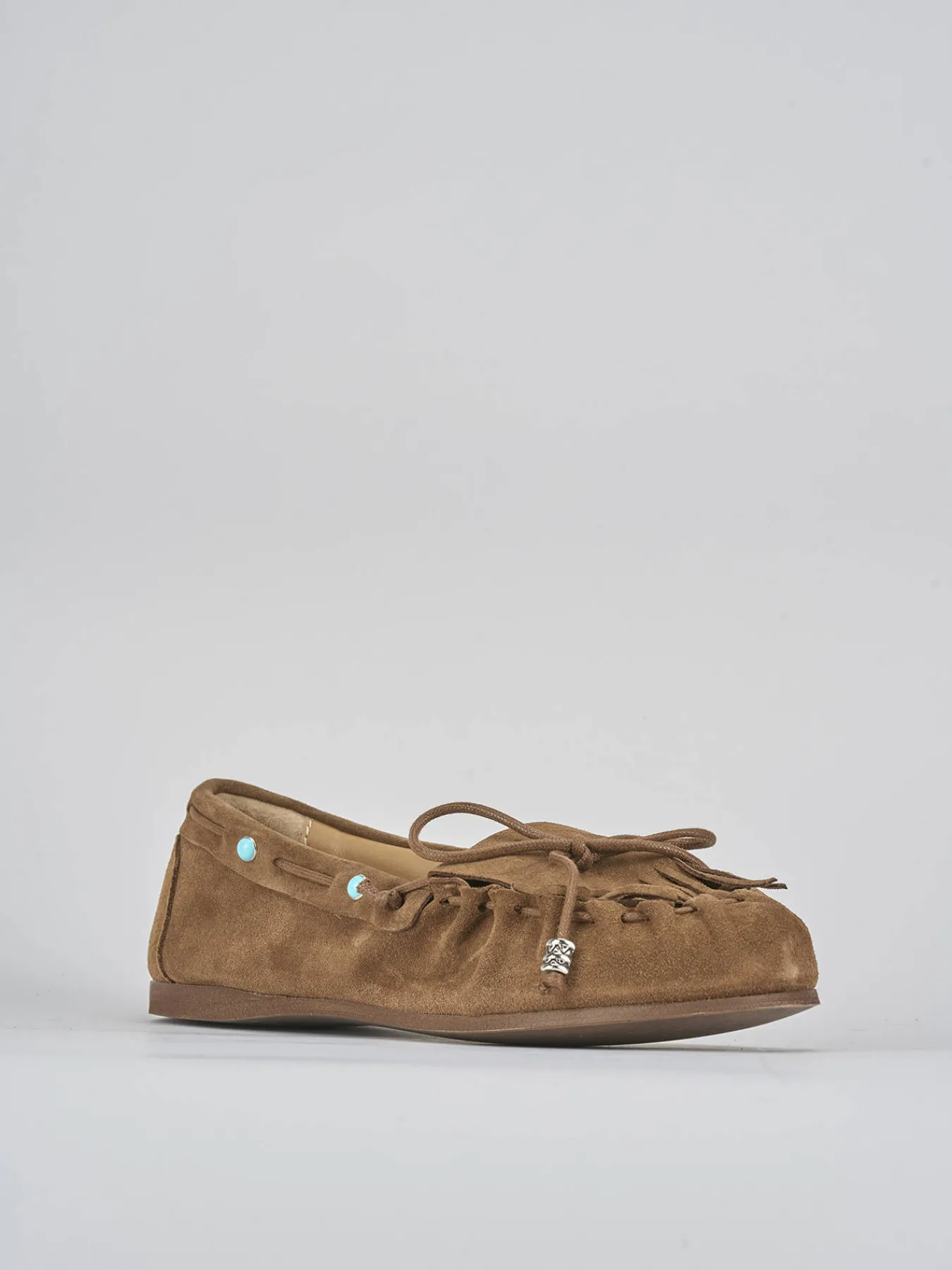 La tomaia è realizzata in morbida pelle scamosciata, arricchita da un elegante fiocco con frange e dettagli in metallo a contrasto, per un tocco di classe in più.