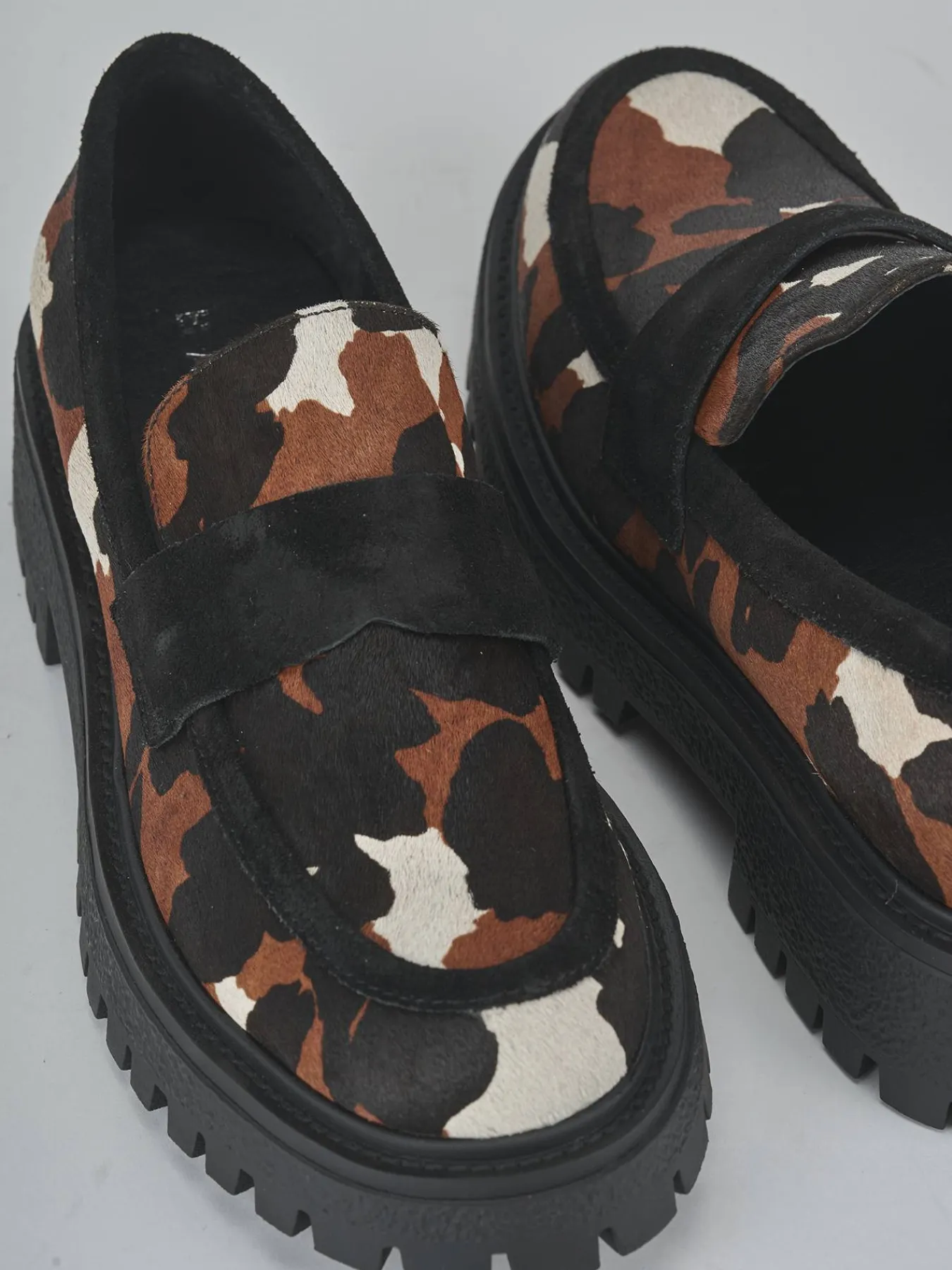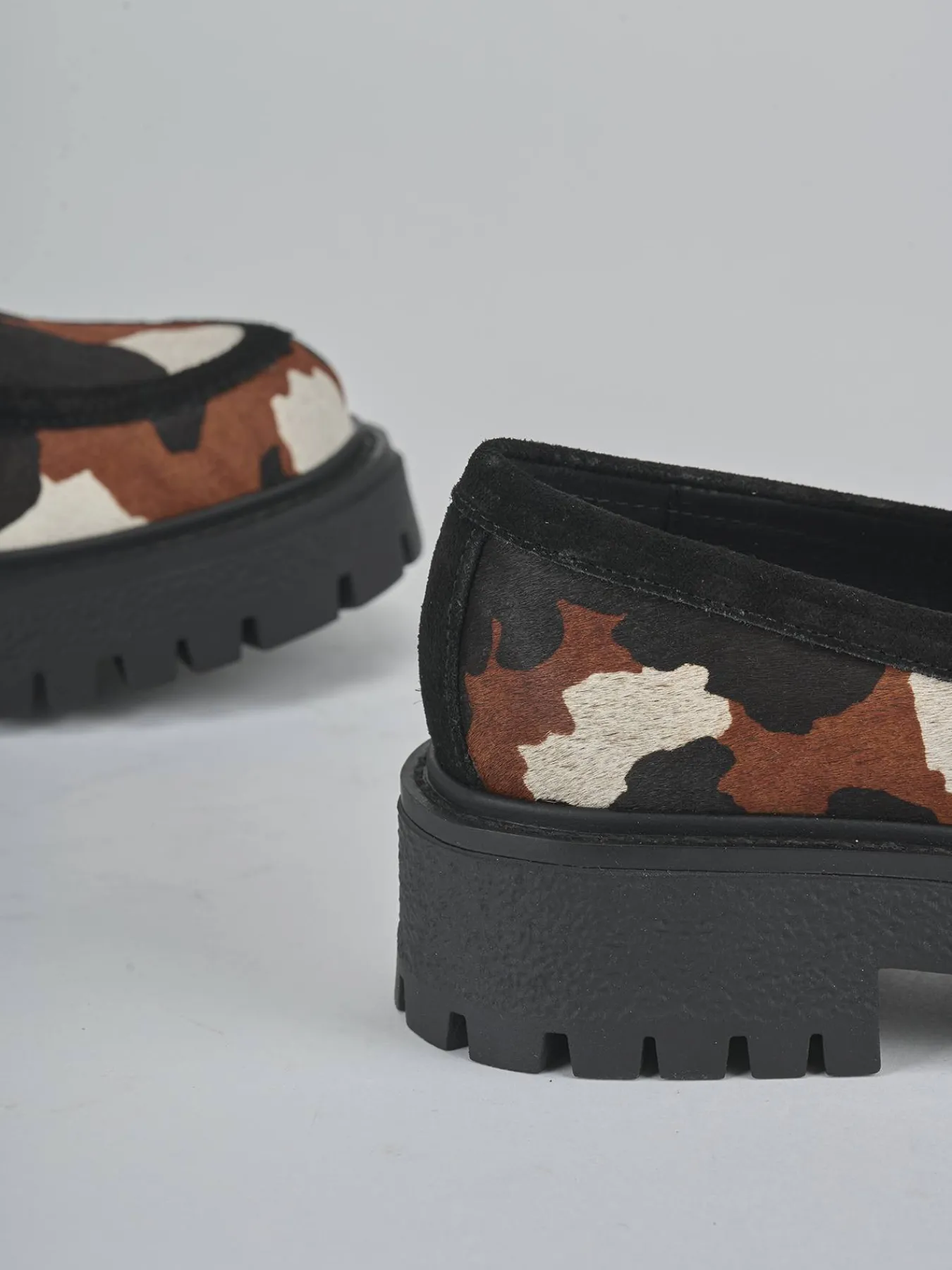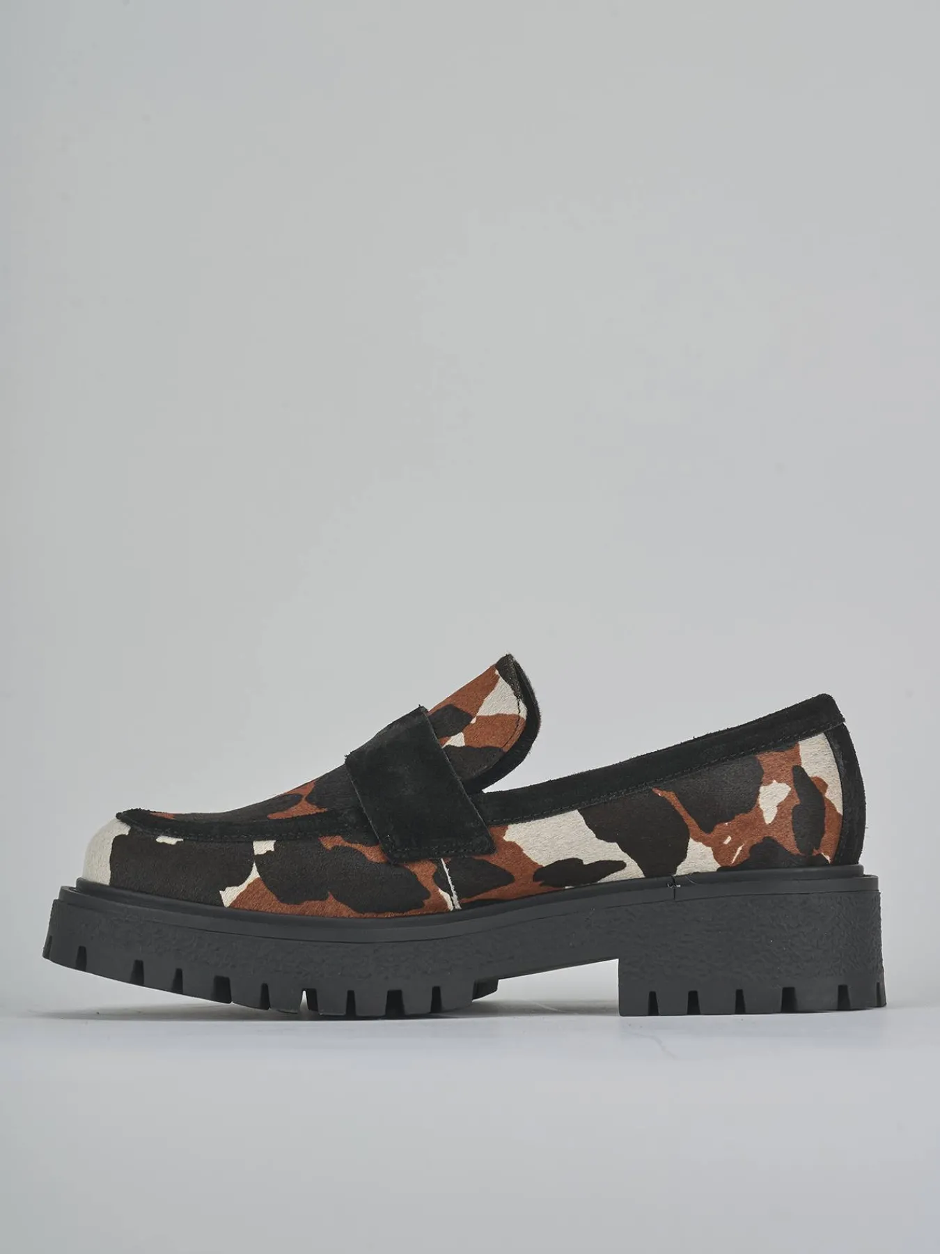 La tomaia è realizzata in morbida pelle, foderata in cavallino con una stampa muccata che aggiunge un tocco di originalità al tuo look quotidiano.