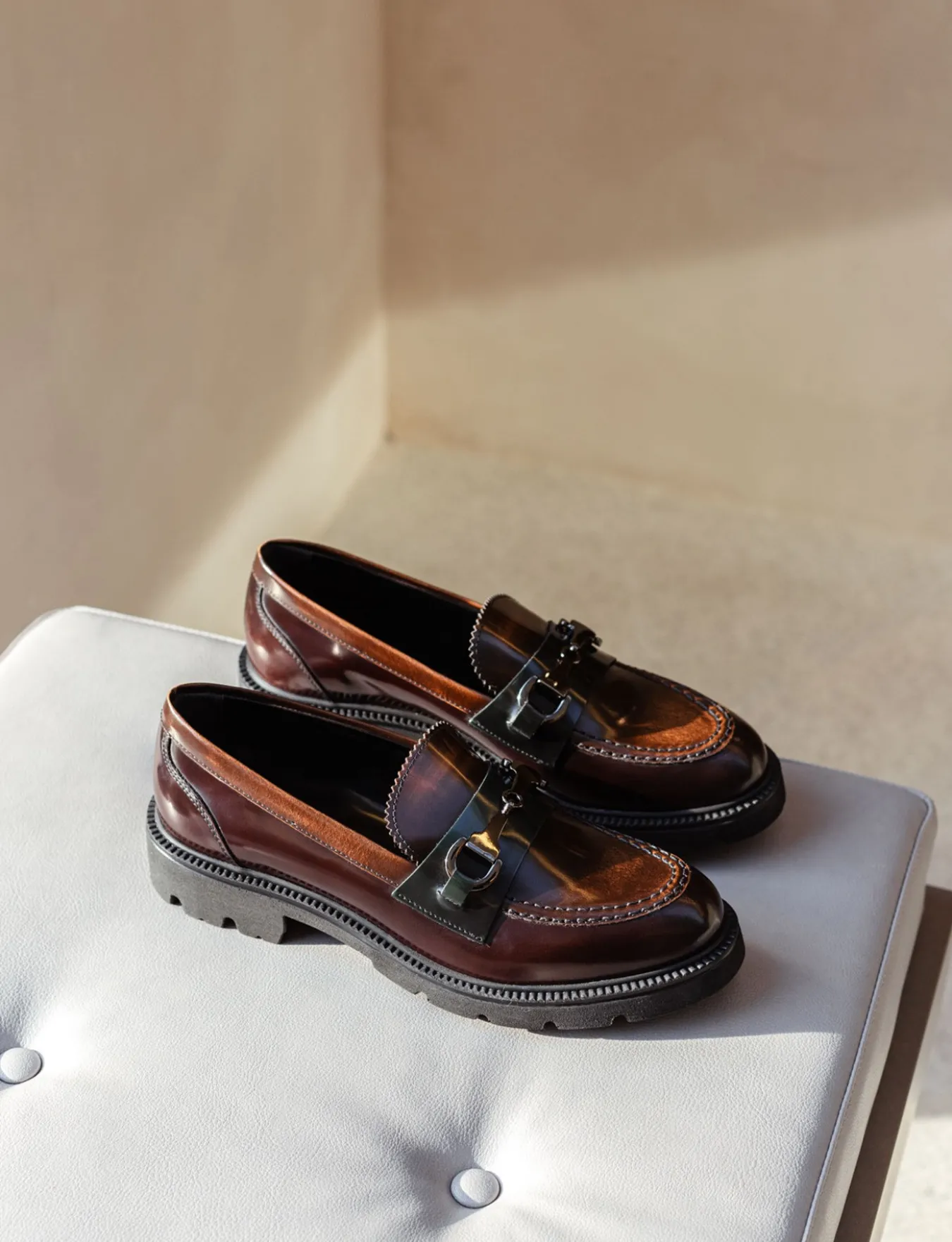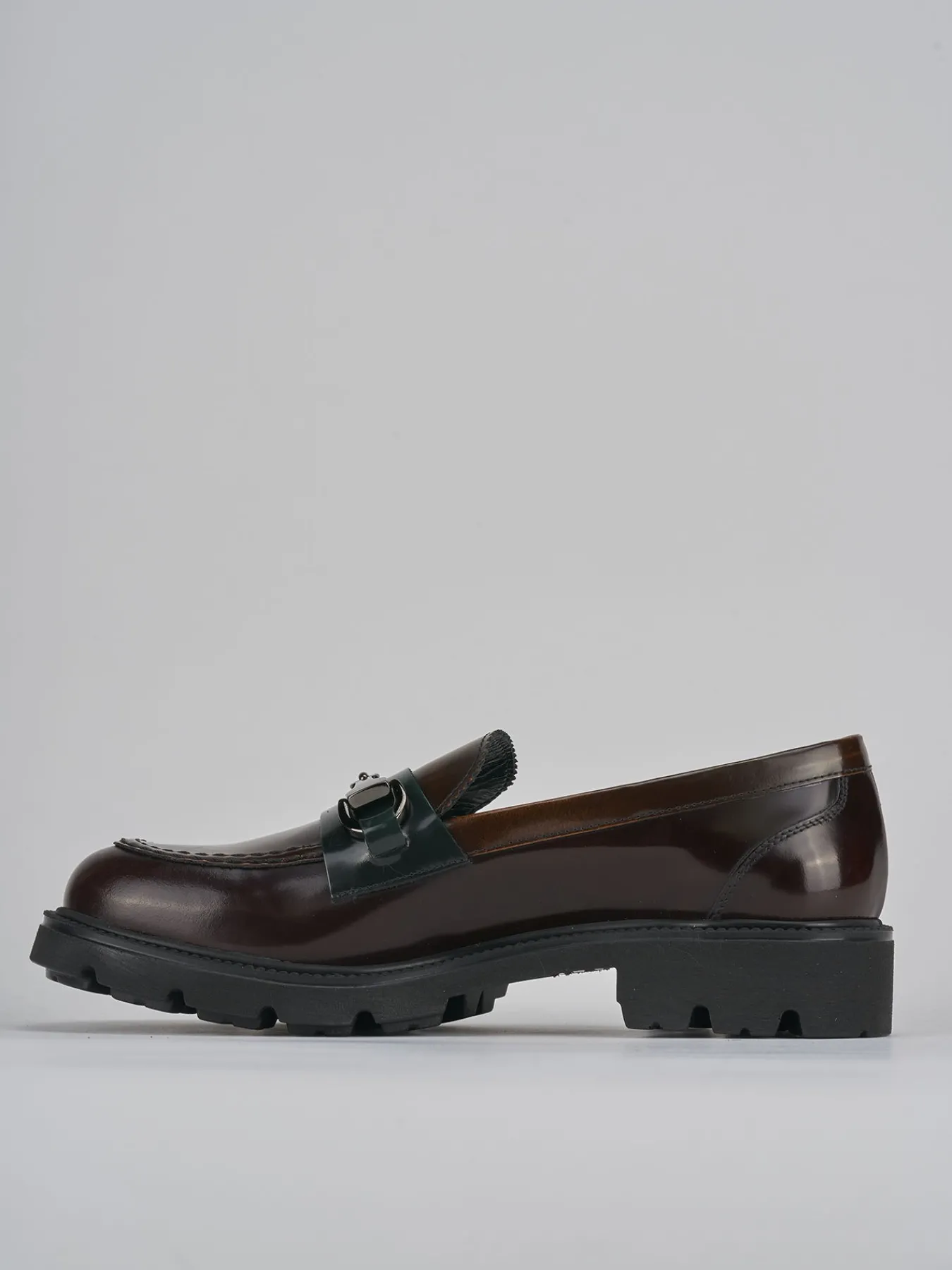 Mocassino tacco 2 cm fondo in gomma e soletto interno in vera pelle. Tomaia in morbida pelle abrasivata lucida, punta leggermente squadrata, cuciture ben visibili, mascherina in contrasto con la tomaia, morsetto e particolare fondo extra light per un look cool.