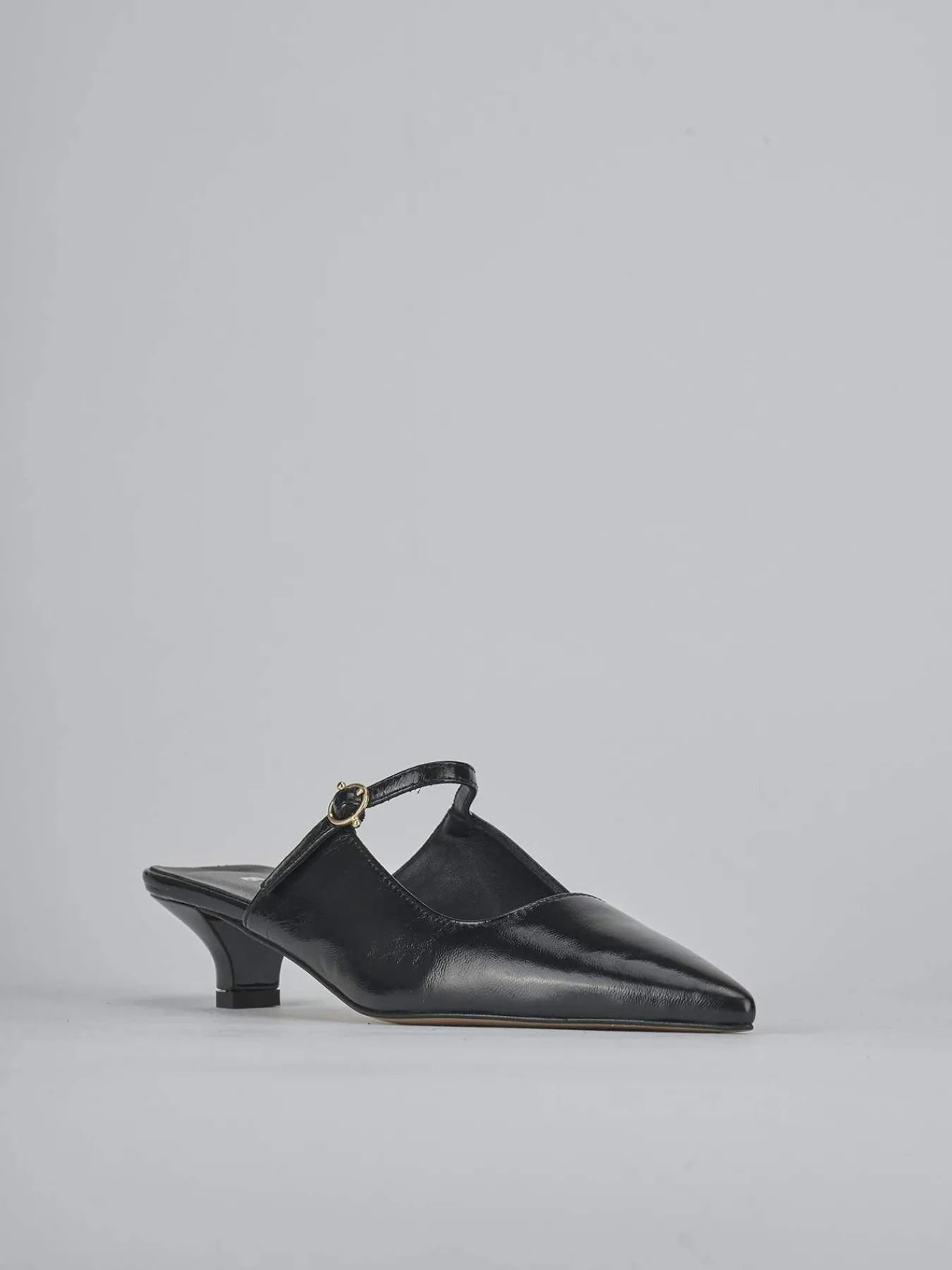 Sabot tacco 3 cm fondo in leggerissima gomma e soletto interno in vera pelle. Tomaia in morbida pelle effetto verniciato, punta sfilata, scollo squadrato, cuciture a mano, cinturino con fibbia regolabile e tacco rocchetto. Perfetto per qualsiasi occasione.