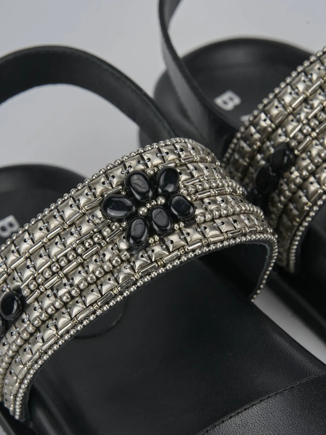 Realizzati con una tomaia in morbida pelle, presentano due fasce larghe impreziosite da luminosissime pietre e miniborchie a maglia regolare, aggiungendo un tocco di raffinatezza al tuo look quotidiano.