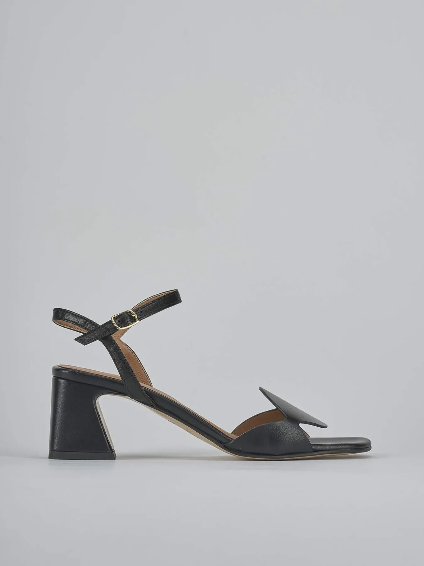 Sandalo tacco 5 cm fondo in leggerissima gomma e soletto interno in vera pelle. Tomaia in morbida pelle, punta squadrata, fascia unica con taglio geometrico, cinturino in caviglia con fibbia regolabile e tacco cool stabile. Perfetto con un vestito o una gonna.